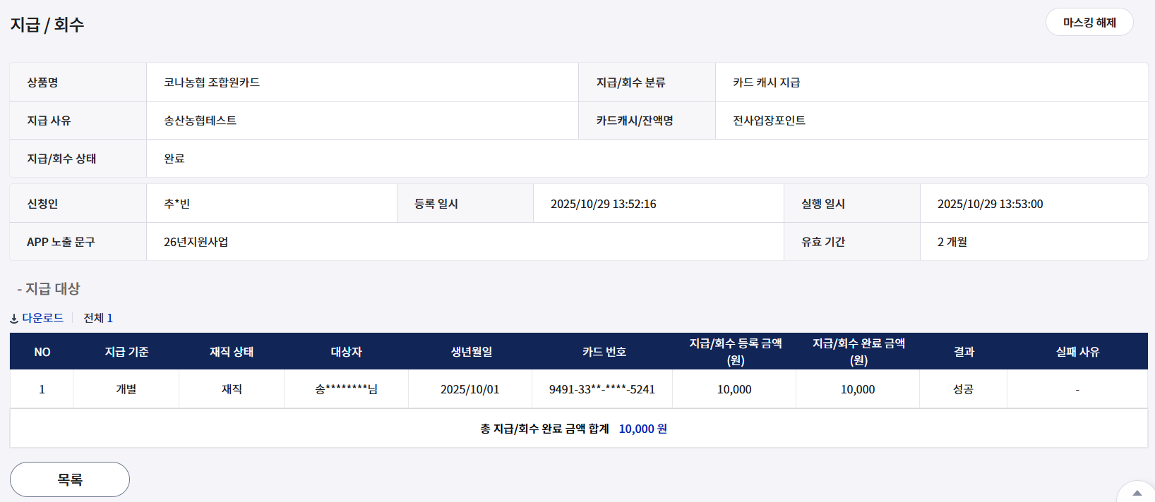 상품명을 클릭하면, 지급/회수 내역을 상세하게 확인 가능합니다.