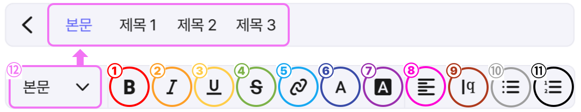 글자 서식 툴 : 작성한 텍스트를 드래그하면 나타납니다.