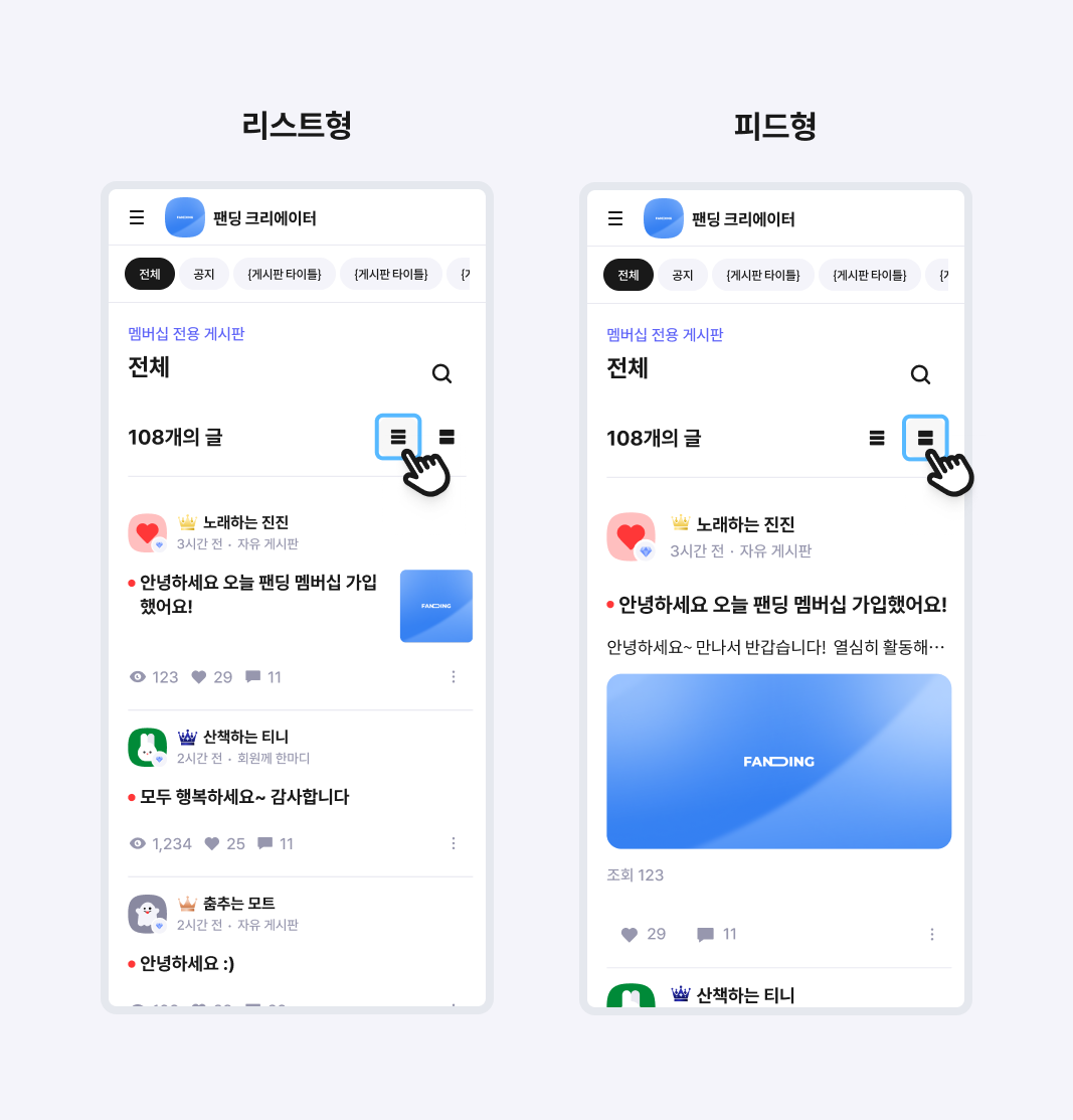 게시판 우측 상단 게시판 형태 아이콘을 클릭하여, 게시판의 화면 형태를 내가 보기 편한 방식으로 자유롭게 설정할 수 있어요.