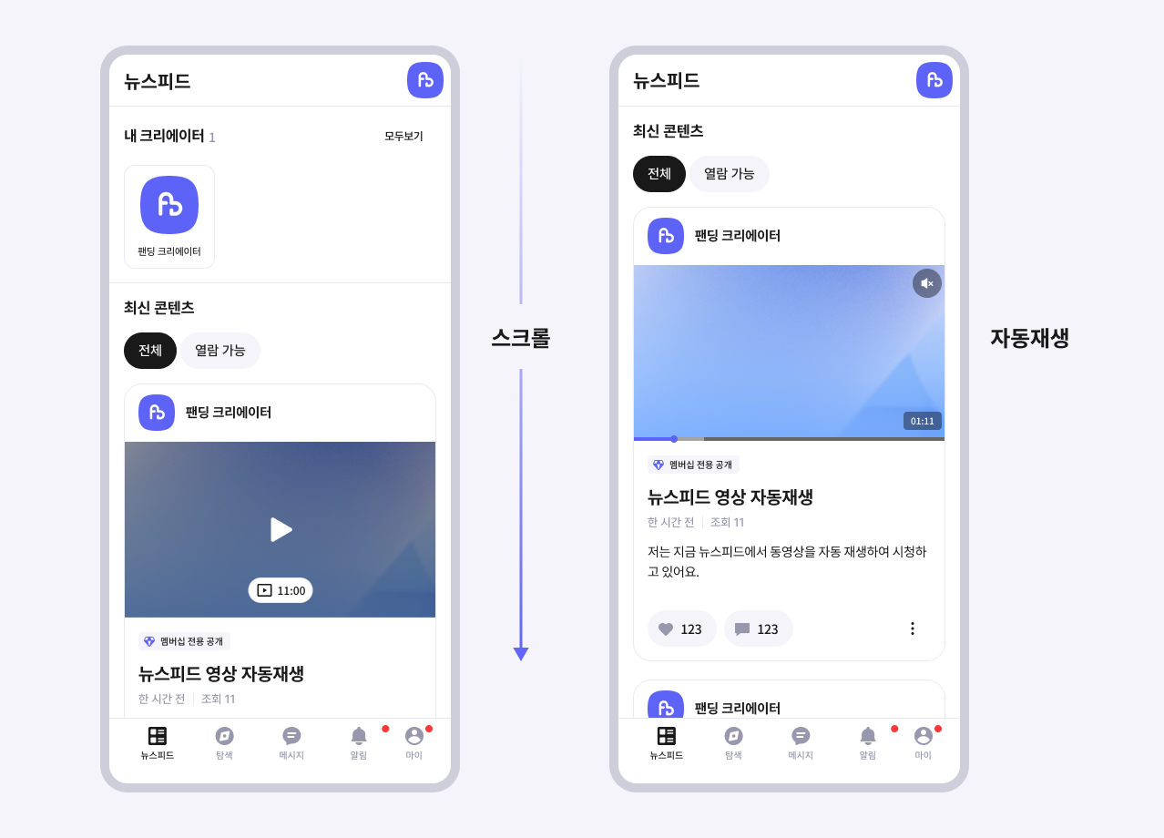 뉴스피드는 크리에이터가 업로드한 포스트를 최신 순으로 확인할 수 있는 공간으로, 각 포스트가 카드 형식의 미리보기로 띄워지는데요. 피드를 스크롤함에 따라 나타나는 포스트 영상의 자동 재생 여부를 설정할 수 있어요.