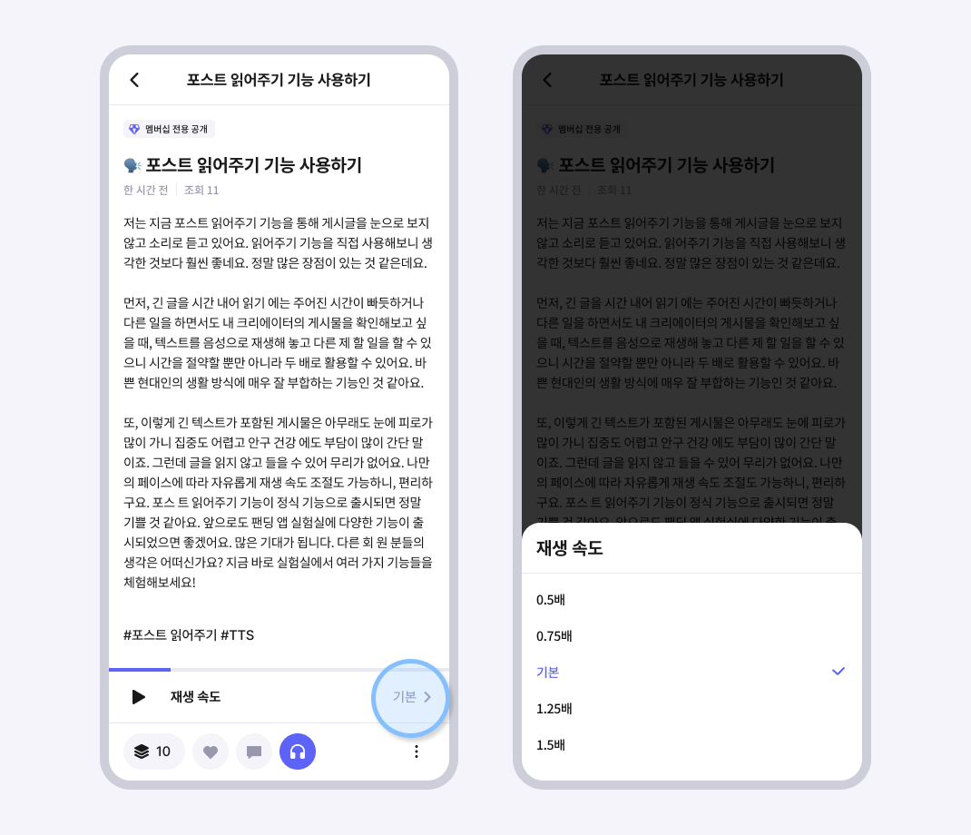 포스트에 포함된 텍스트를 음성으로 변환해요. 긴 글을 눈으로 읽기 부담스러울 때, 읽어주기 기능을 통해 귀로 들을 수 있어요. 배속을 자유롭게 설정하여 내 리듬에 맞게 음성의 속도를 조절할 수도 있어요.