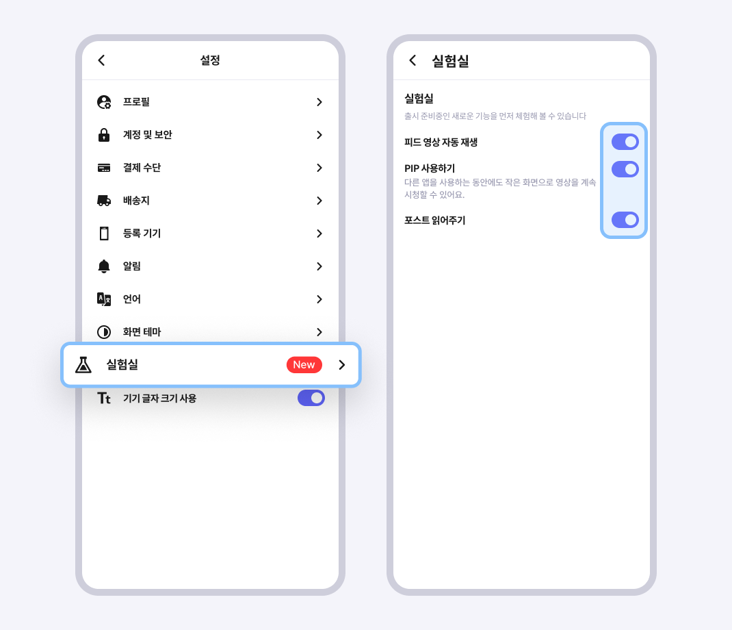 각 기능의 토글을 활성화하여 실험 참여 여부를 설정할 수 있어요.