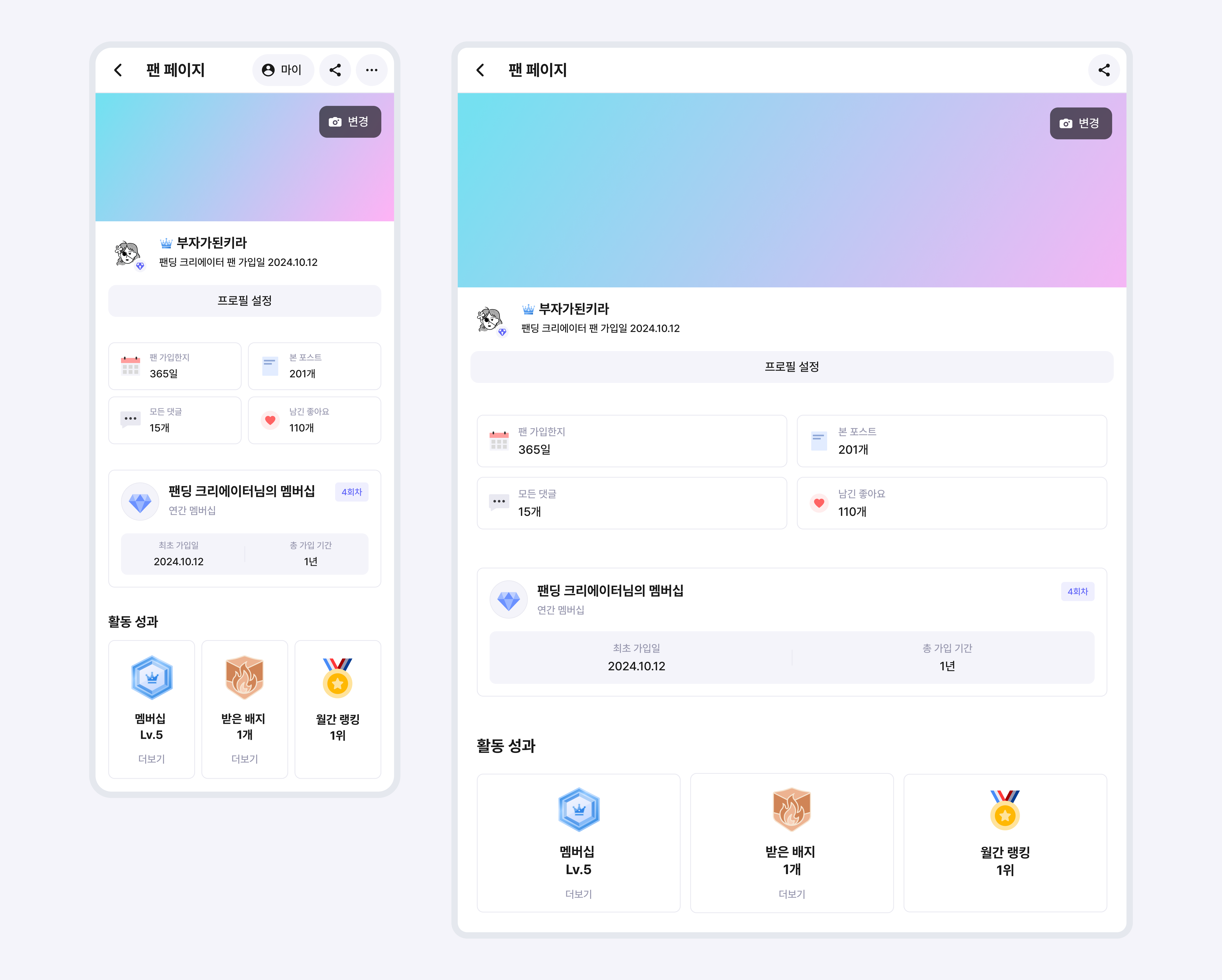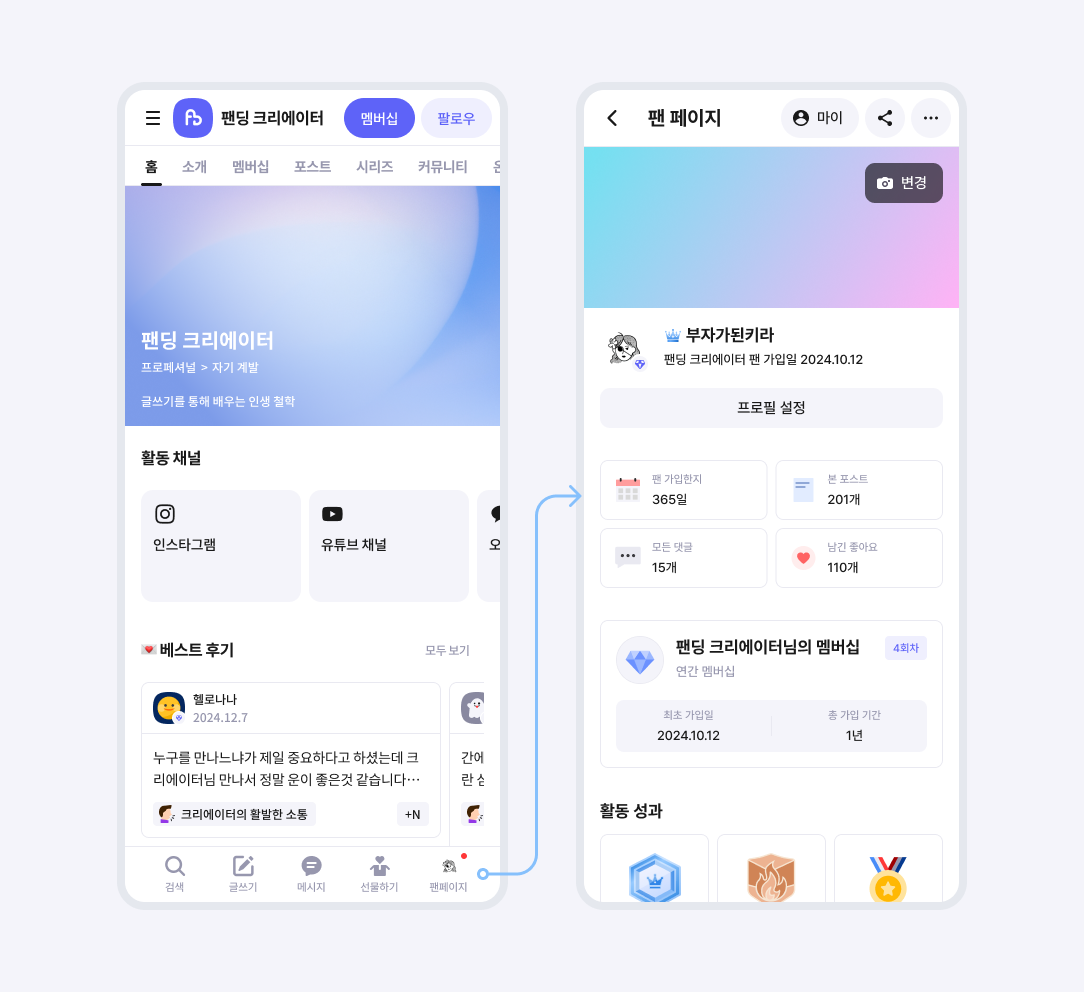 크리에이터의 페이지에서 활동한 내역과 팬 활동을 통해 달성한 성과를 모아볼 수 있는 공간입니다. 크리에이터를 팔로우함과 동시에 생성되며, 팔로우 취소할 경우 비활성화됩니다. 다음과 같이 구성되어 있습니다.