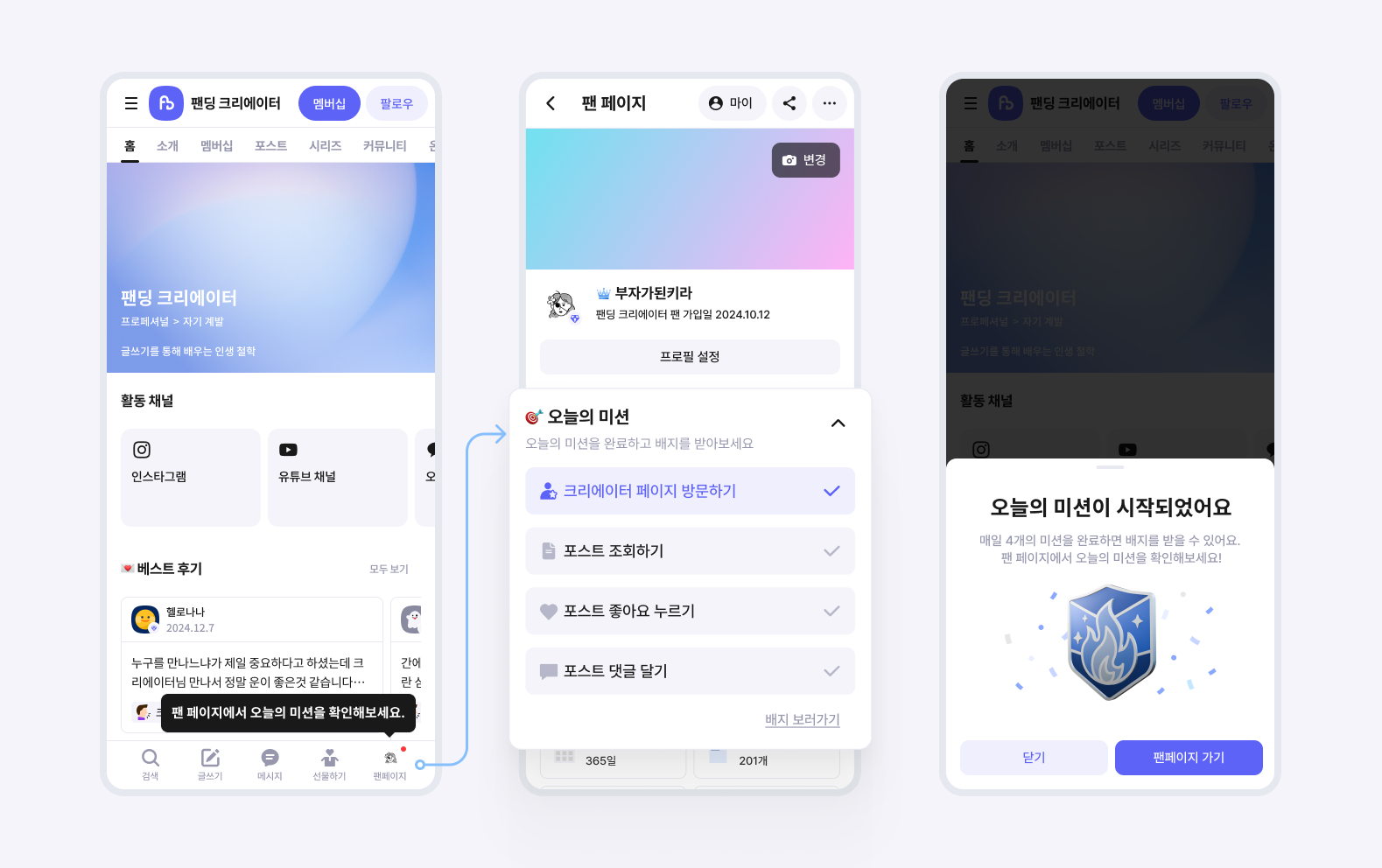 매일 주어지는 총 4가지의 오늘의 미션을 꾸준히 완료해 보세요! 특별한 배지를 획득할 수 있어요. (※ 일부 크리에이터에 한해 운영 중입니다.)