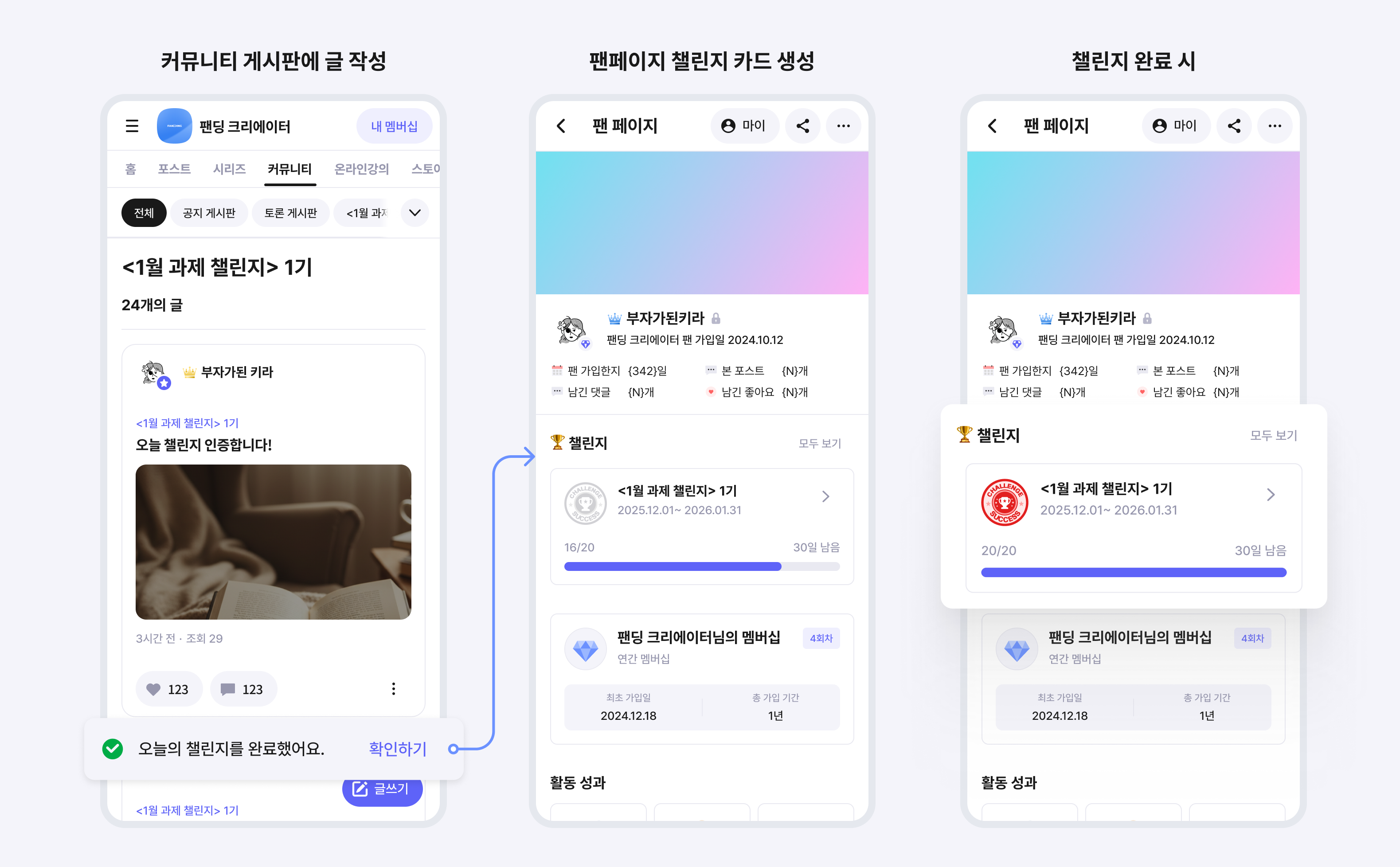 크리에이터, 그리고 다른 팬들과 함께 목표 달성에 도전하는 참여형 콘텐츠예요. 챌린지에 참여하여 나의 도전을 기록하고, 다른 팬들의 도전을 응원해 보세요.