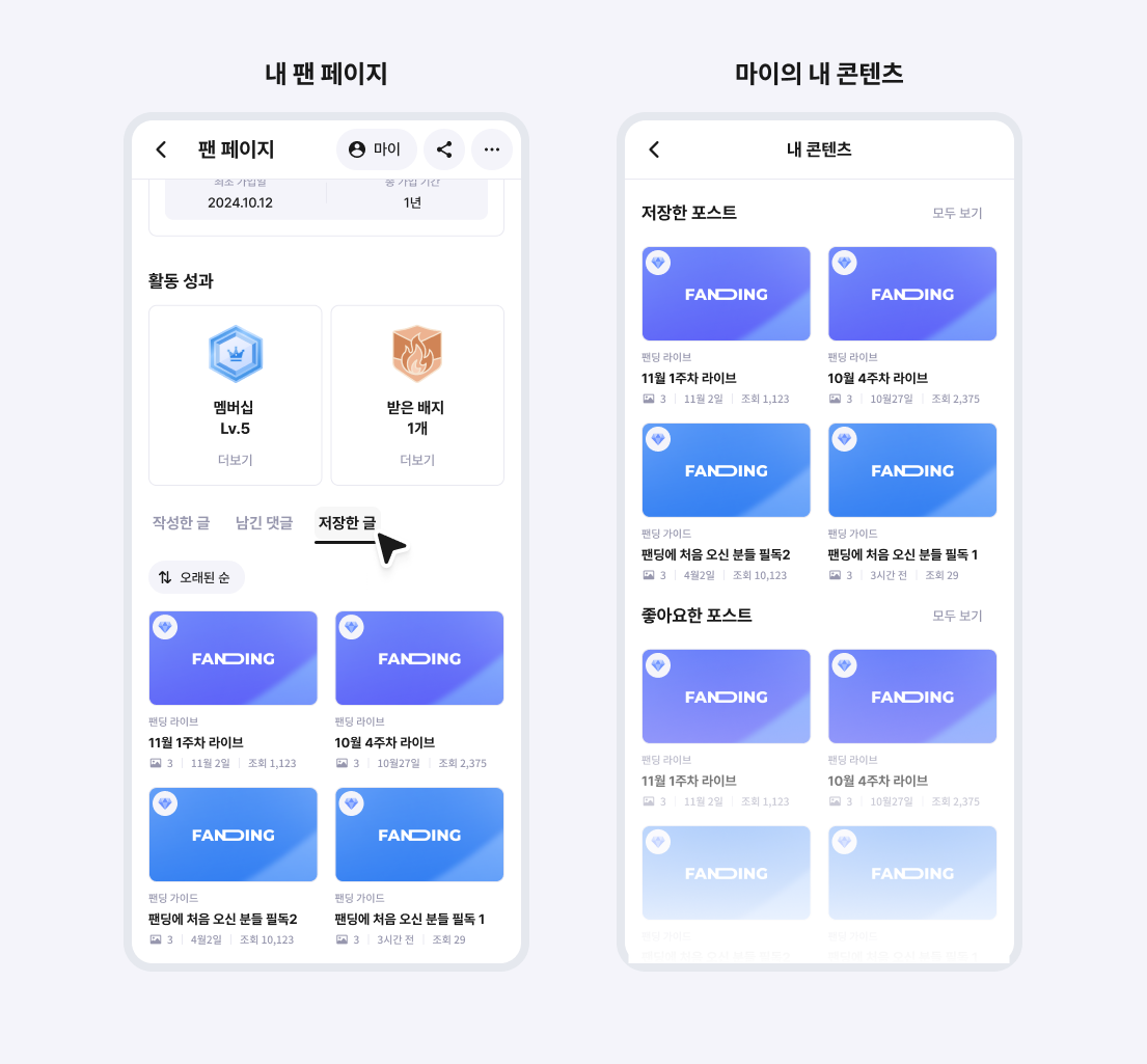 저장한 포스트는 팬페이지, 그리고 마이 페이지에서 모아볼 수 있어요.