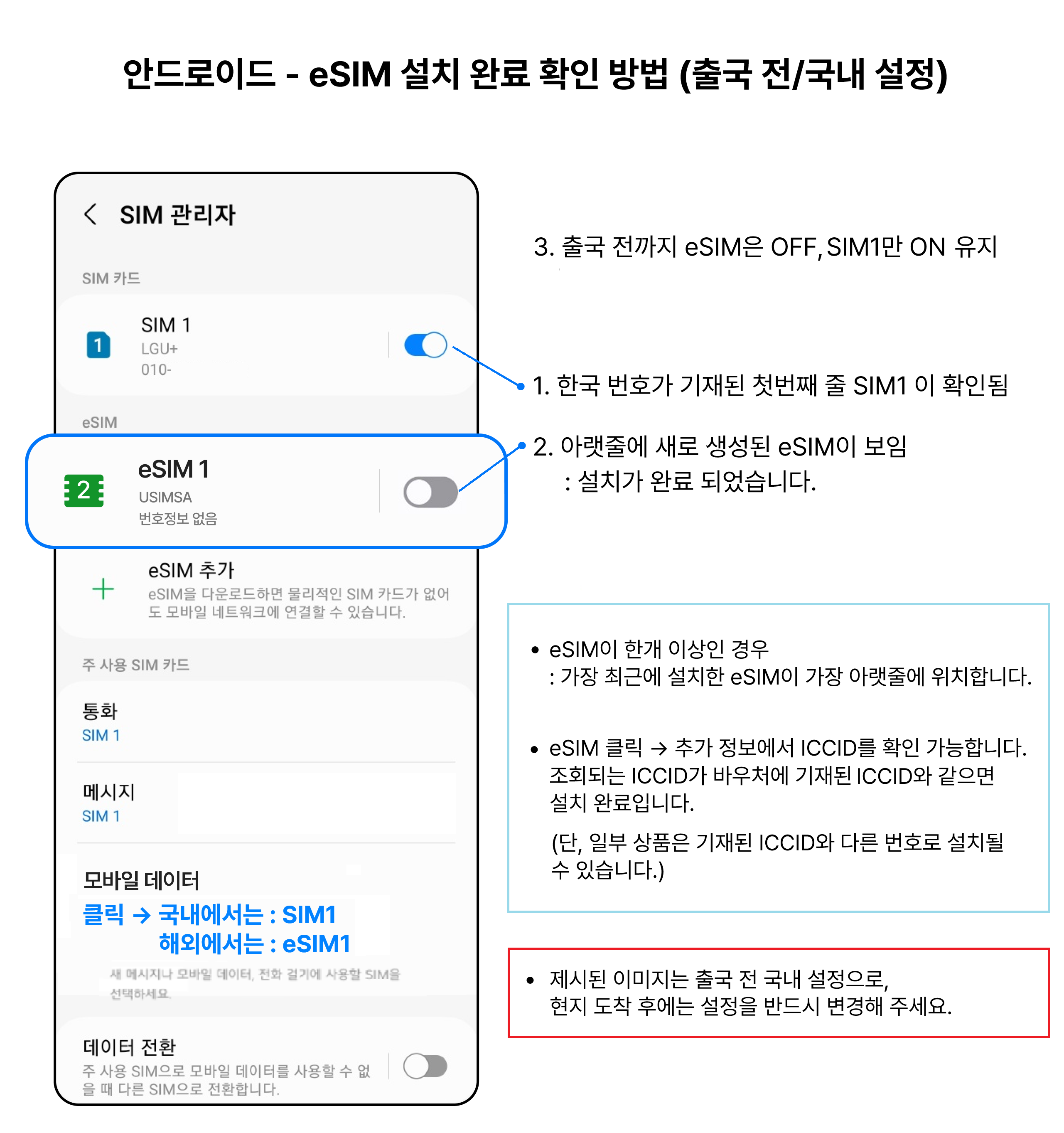 • eSIM 부분에서 가장 아랫줄에 위치한 eSIM2 가 가장 최근에 설치한 eSIM 입니다.