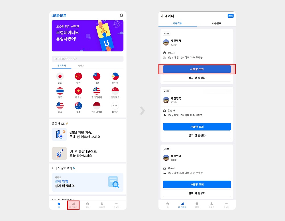 유심사 홈페이지가 아닌, 외부 사이트에서 구매해 주셨을 경우 아래 과정을 진행해 주셔야 사용량 조회나 충전 및 연장 기능을 사용하실 수 있어요. (네이버 스토어,쿠팡 등..)