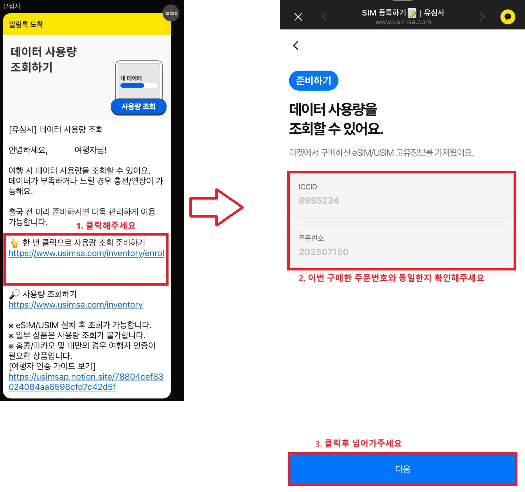 사용량 조회 혹은 충전 및 연장이 필요한 상품의 주문 번호와 ICCID를 입력해 주세요.