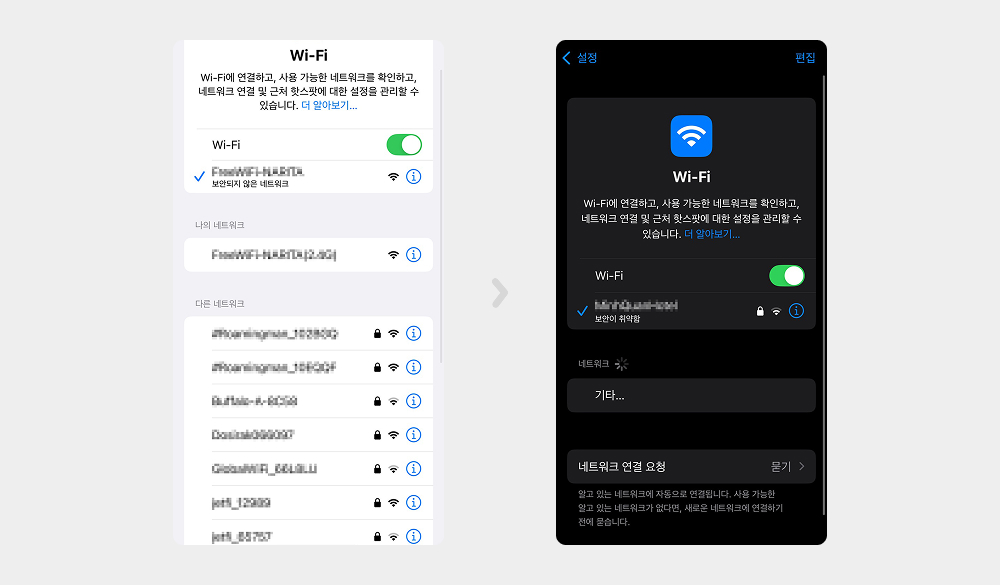 설치 시 '보안 되지 않은 네트워크', '보안이 취약함' 으로 되어 있는 와이파이 환경에서는 설치가 어려울 수 있어요.
