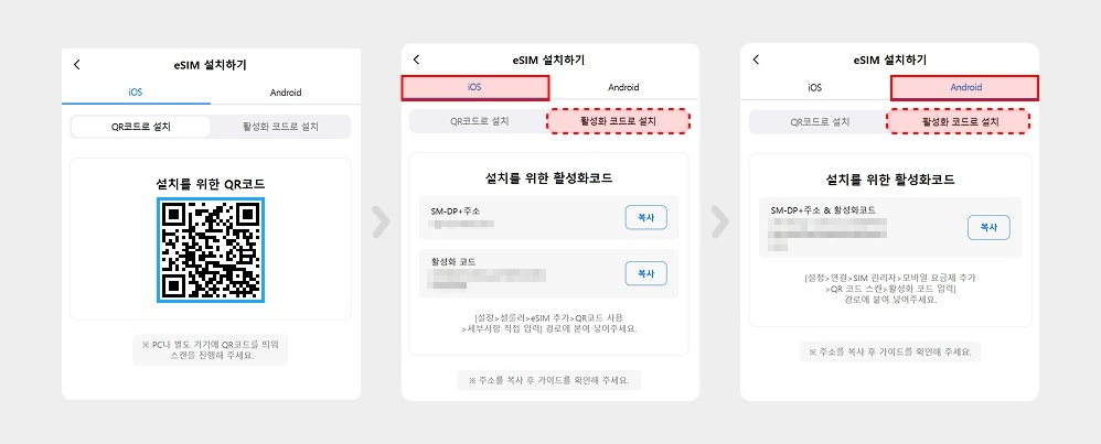 3. 열람한 QR코드 및 활성화코드를 캡쳐 혹은 복사하여 실제 사용하실 분께 전달해주시면 사용 가능해요. (IOS / Android 기종별로 선택하여 알맞은 코드 정보 확인이 가능해요.)