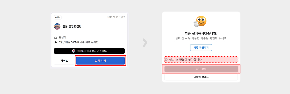 eSIM 상품의 경우 "설치" 가 완료되었다면 환불이 불가해요. 꼭 참고 부탁 드려요.