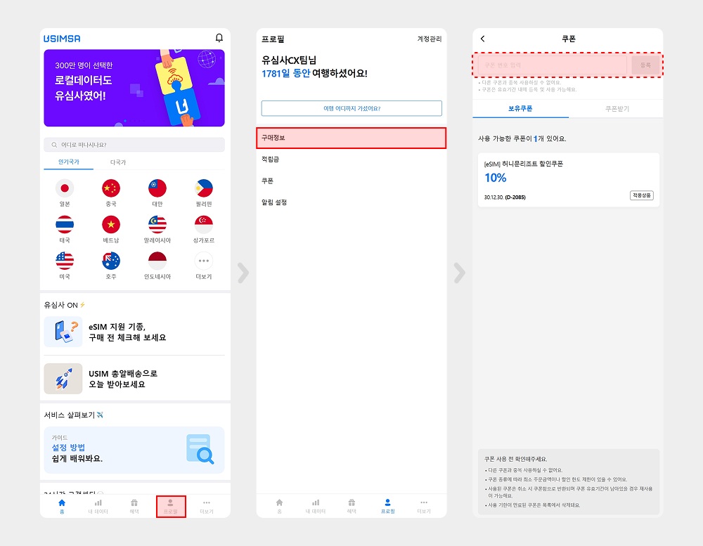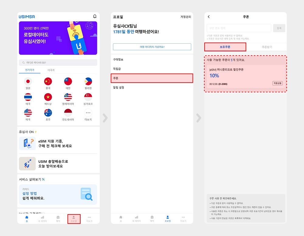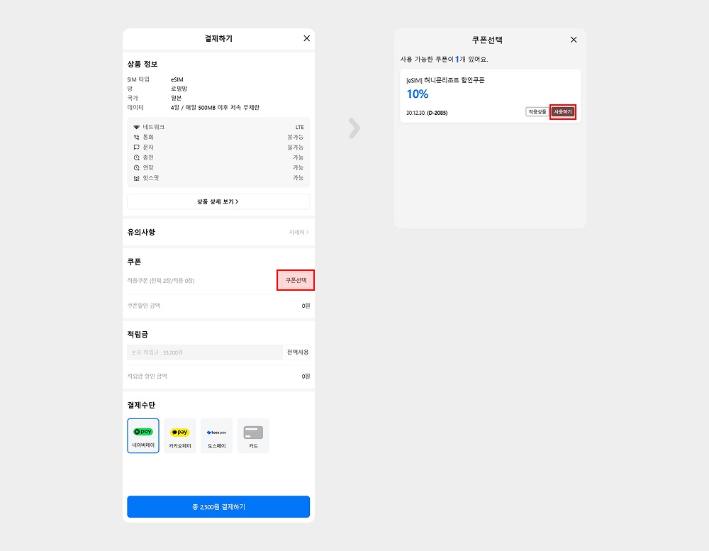 방문 예정이신 국가 선택 → 일수 및 용량 선택 → 쿠폰 선택 클릭 → 사용할 쿠폰을 선택