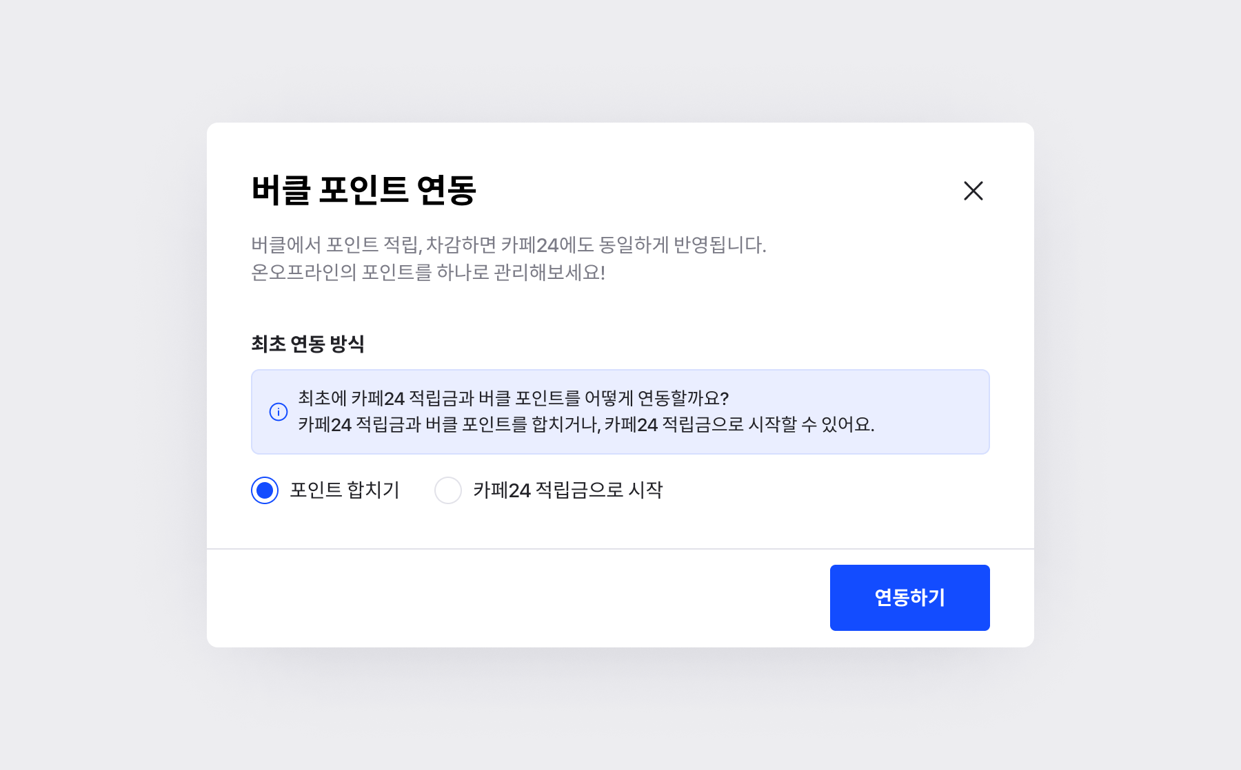 • 포인트와 적립금을 합치거나 카페24 적립금 기준으로 시작할 수 있어요