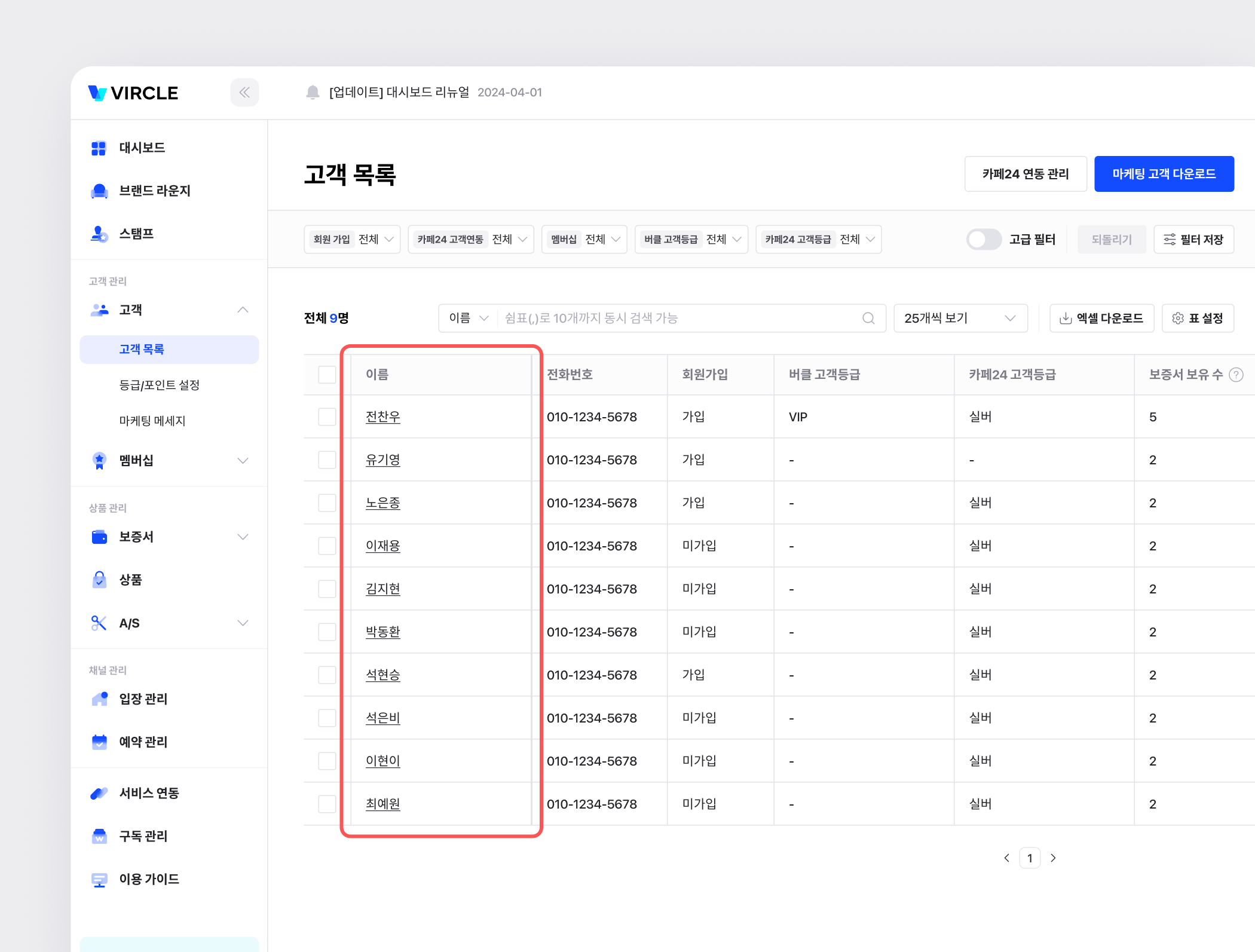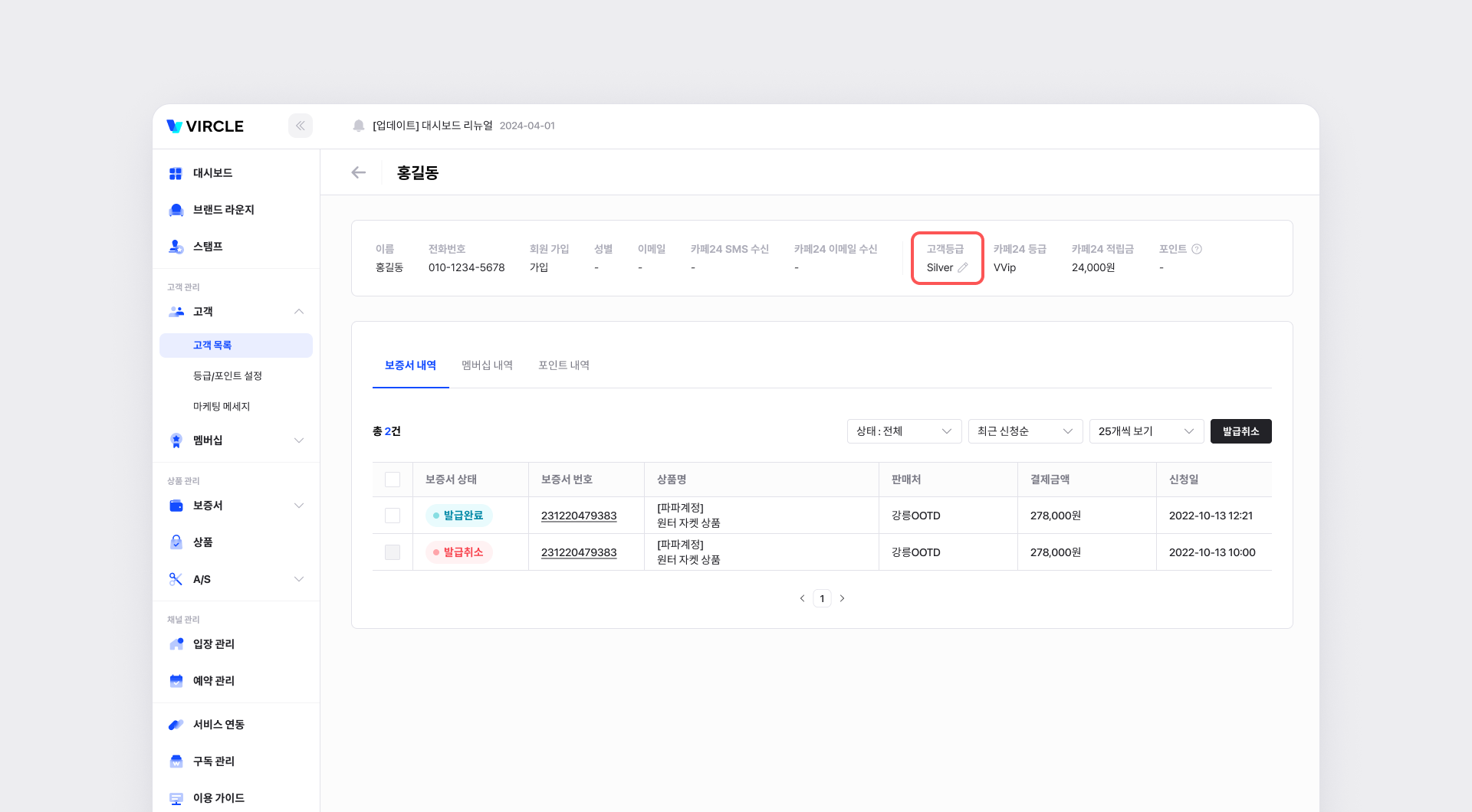 • [연필 아이콘]을 클릭하여 해당 고객의 등급을 수동으로 조정할 수 있습니다.