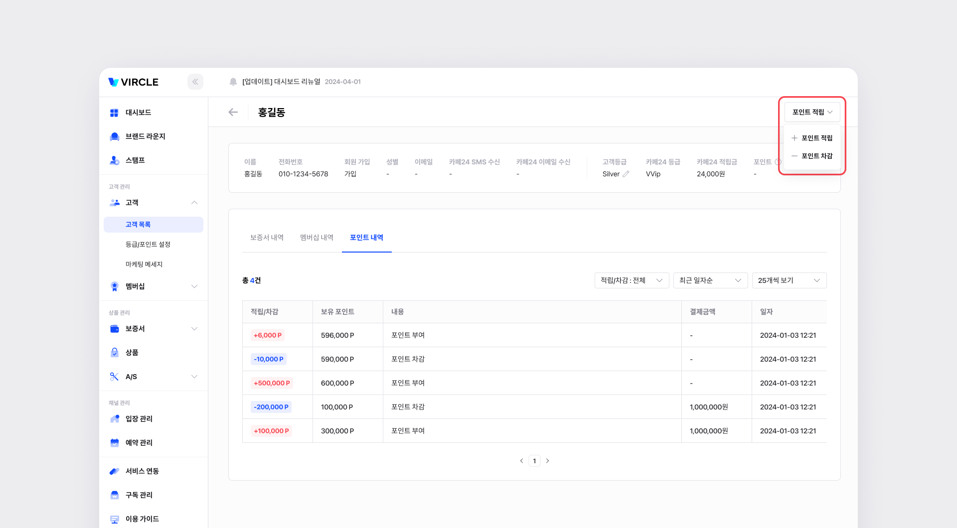 이 페이지에서 포인트를 적립하거나, 차감할 수 있습니다.