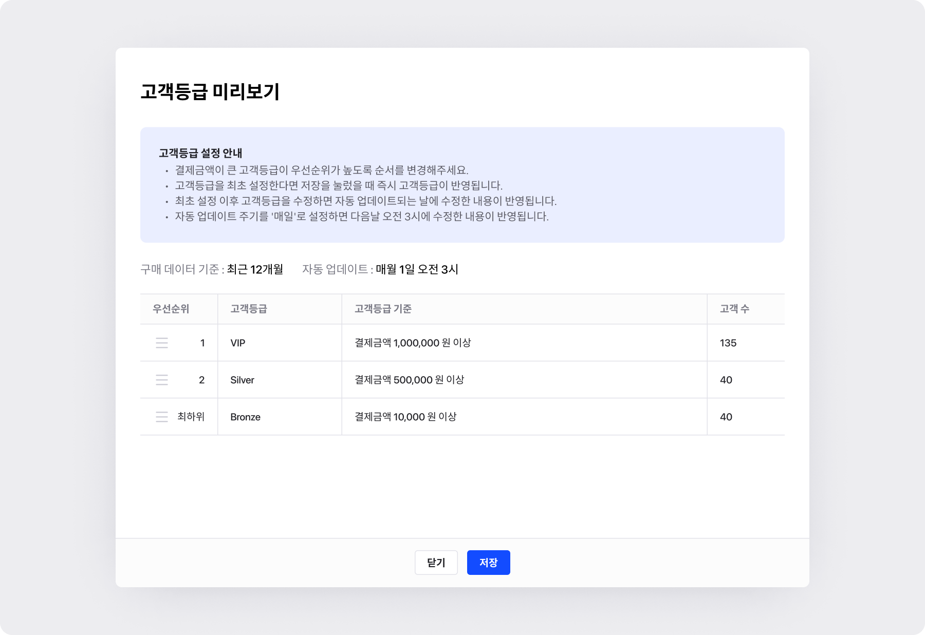 • 저장하면, [고객등급 미리보기]가 표시됩니다.