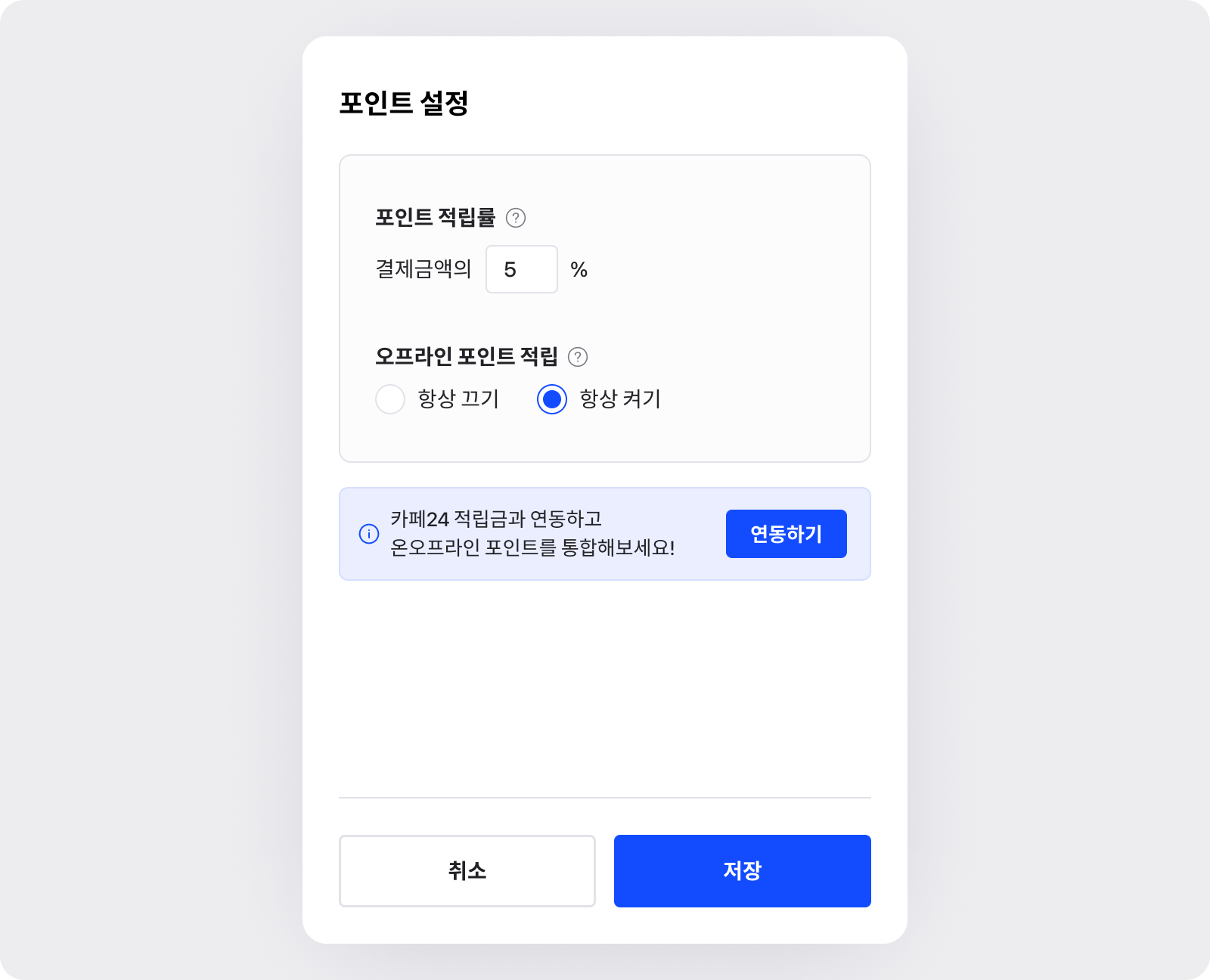 포인트 적립률을 직접 설정하여, 결제금액의 일부를 포인트로 적립할 수 있게 하는 기능이에요.