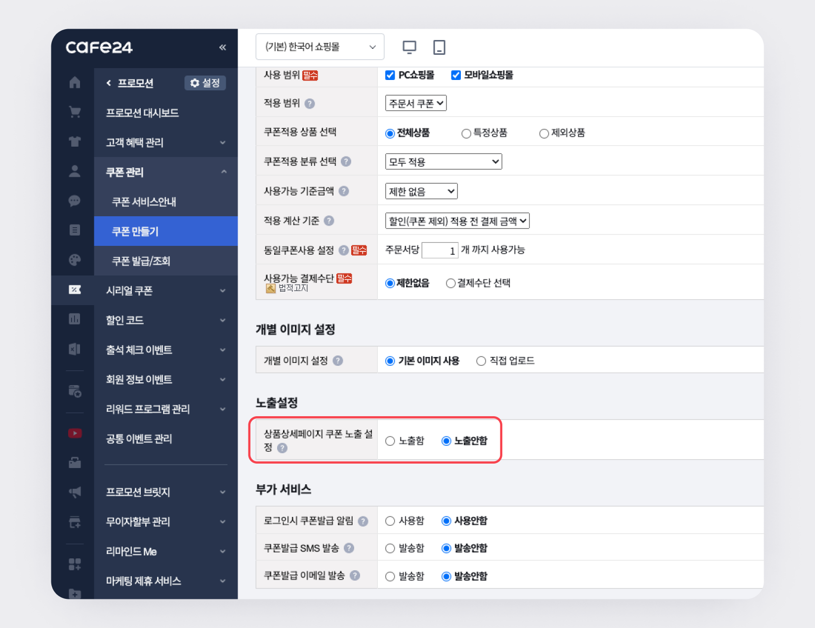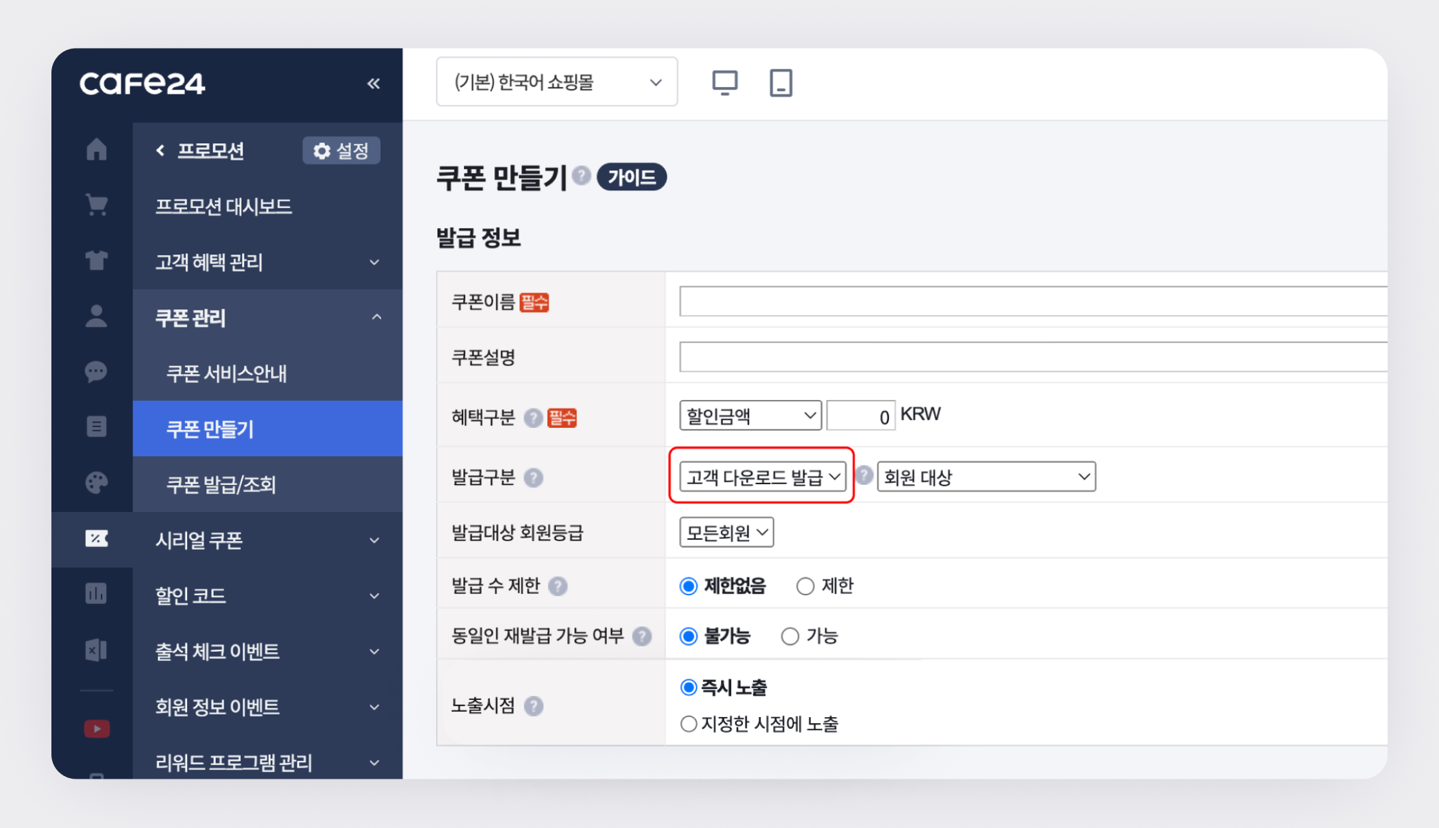 [카페24 쇼핑몰 관리자 센터 → 프로모션 → 쿠폰 관리 → 쿠폰 만들기]에서