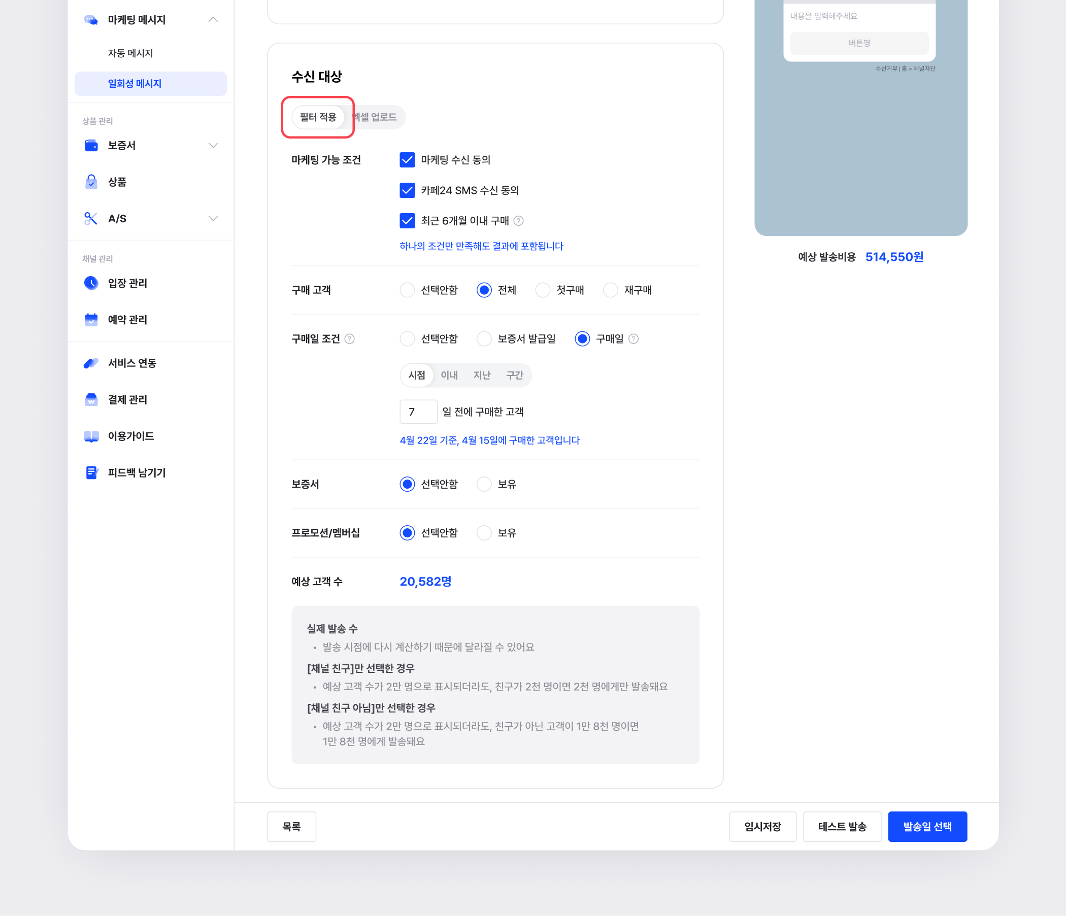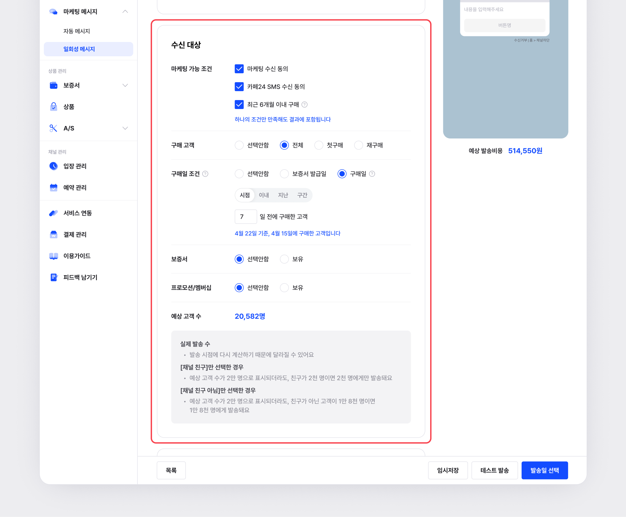 ‘14일 이내 구매’한 고객으로 설정했다면 메시지가 발송되지 않습니다