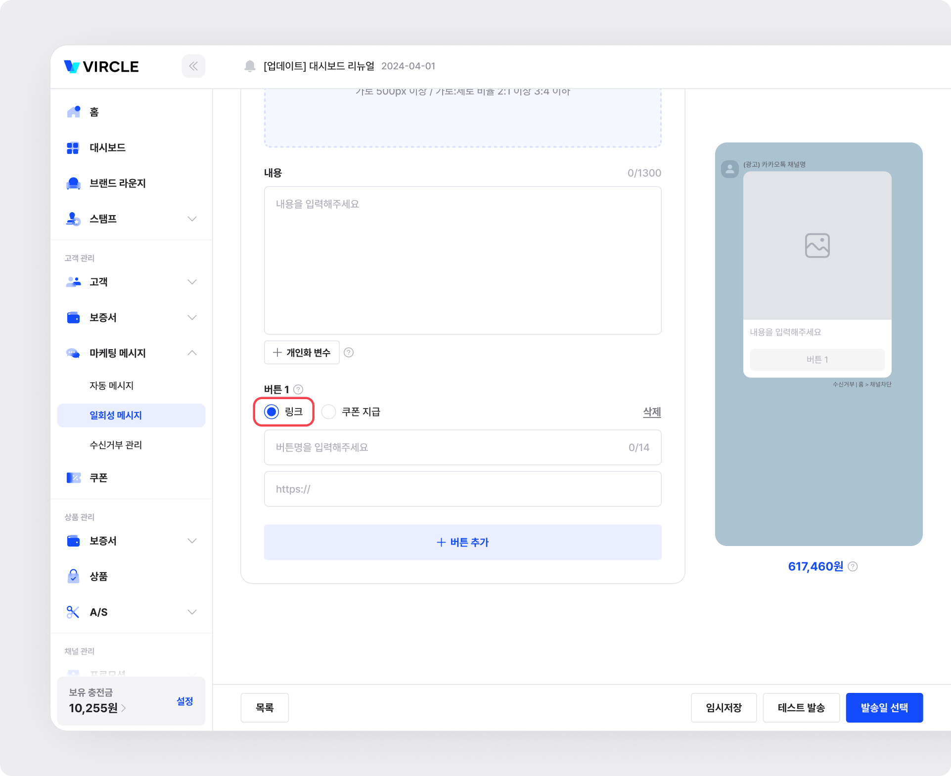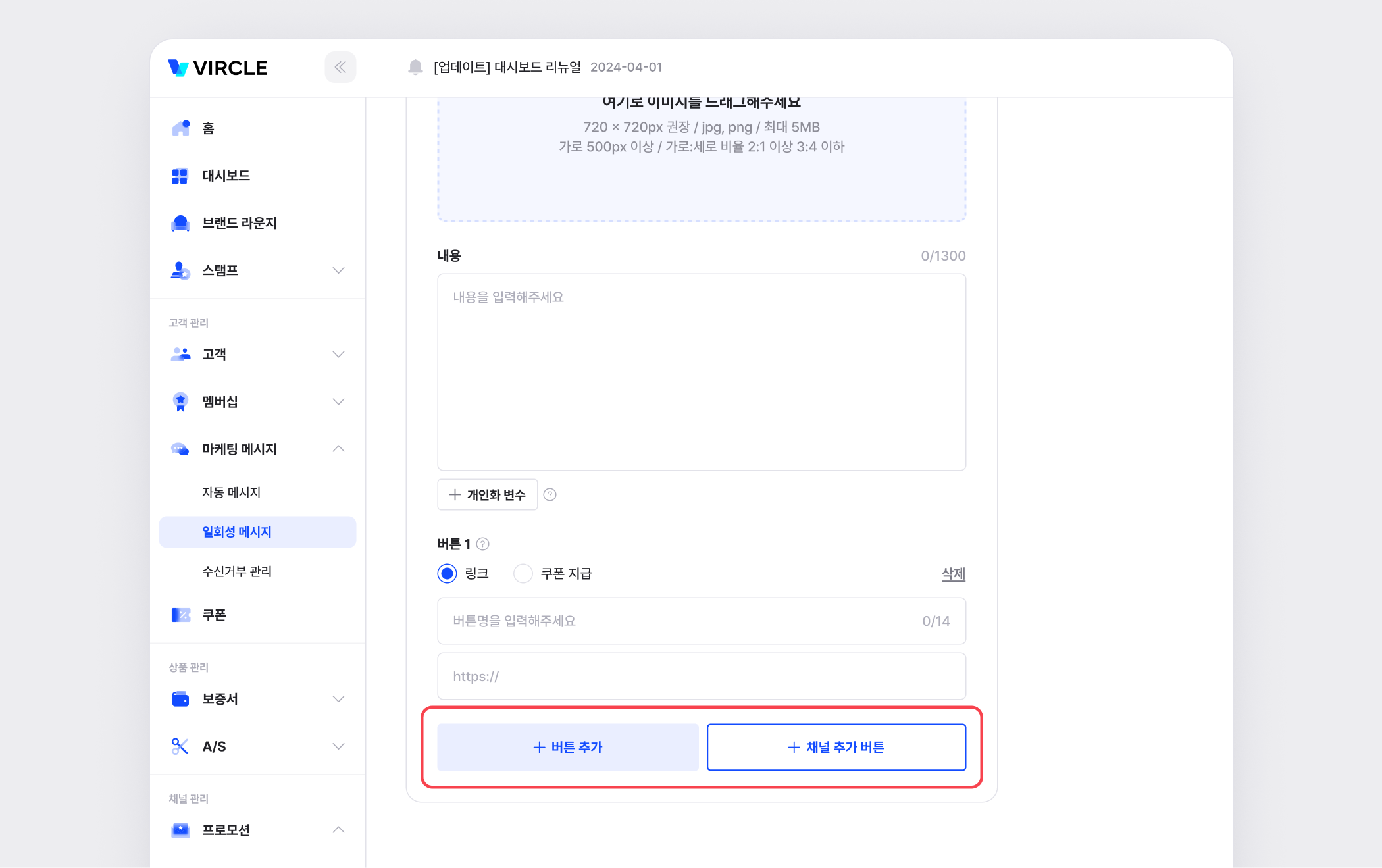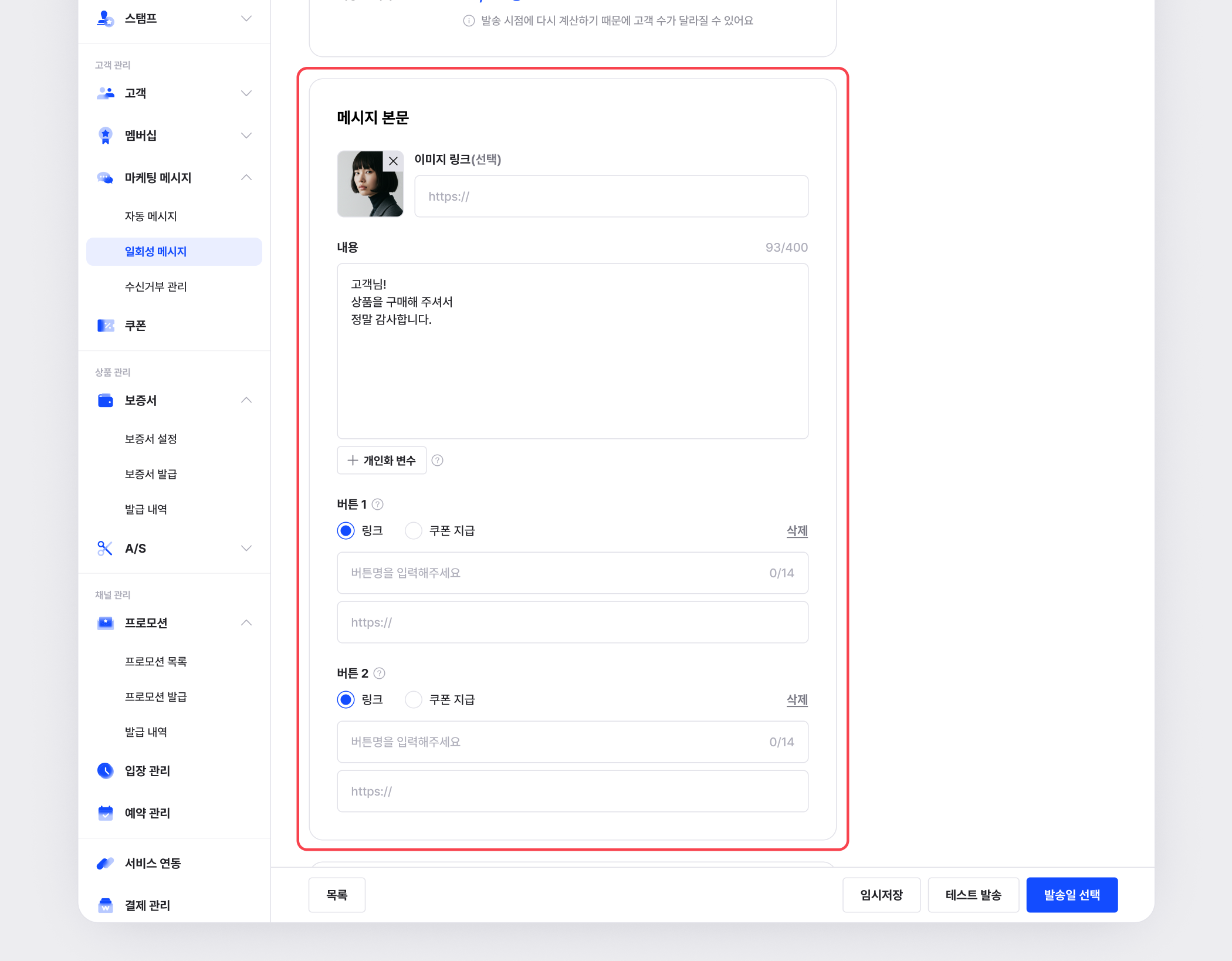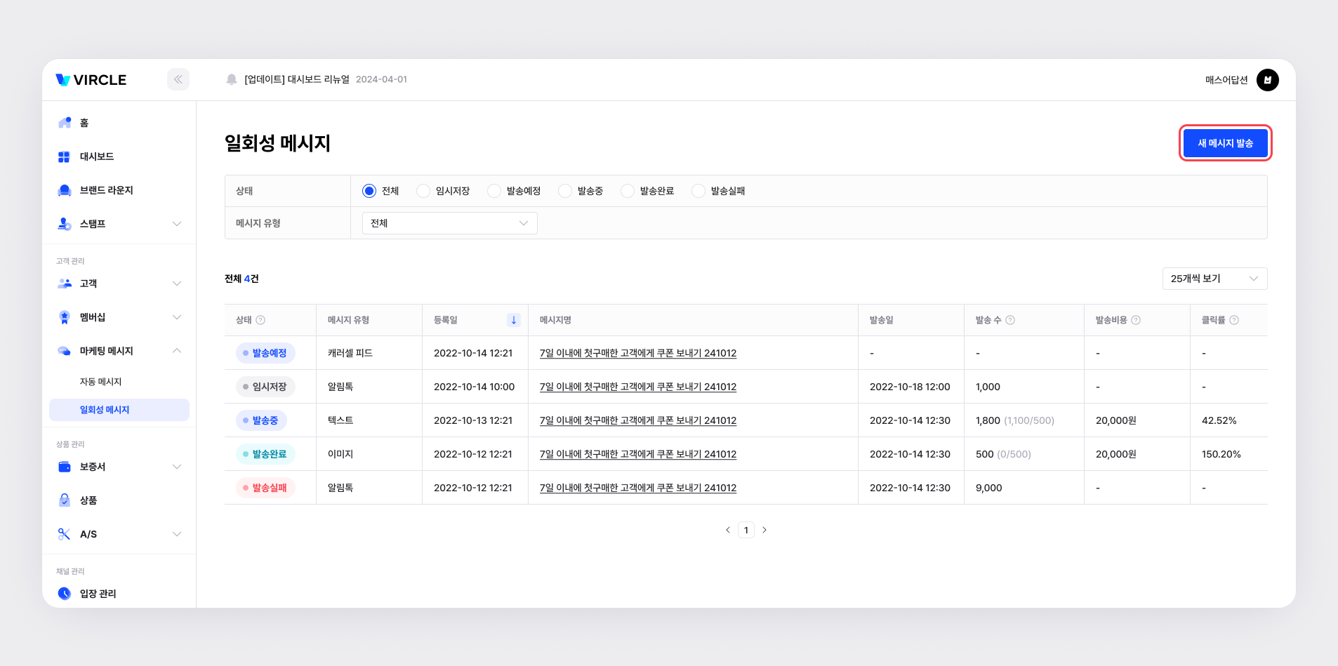 일회성 메시지는 특정 시점에 한 번만 발송되는 메시지입니다.