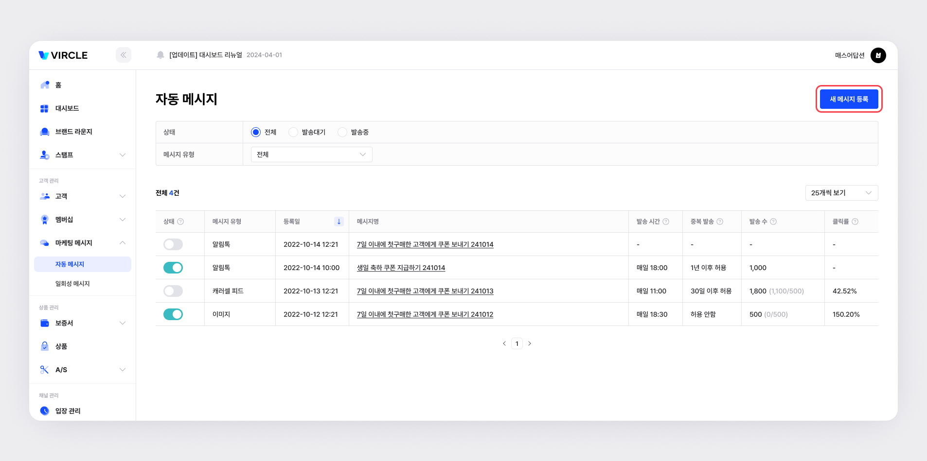 완료버튼을 클릭하면, 자동 메시지 등록이 완료돼요.등록한 자동 메시지를 발송하기 위해