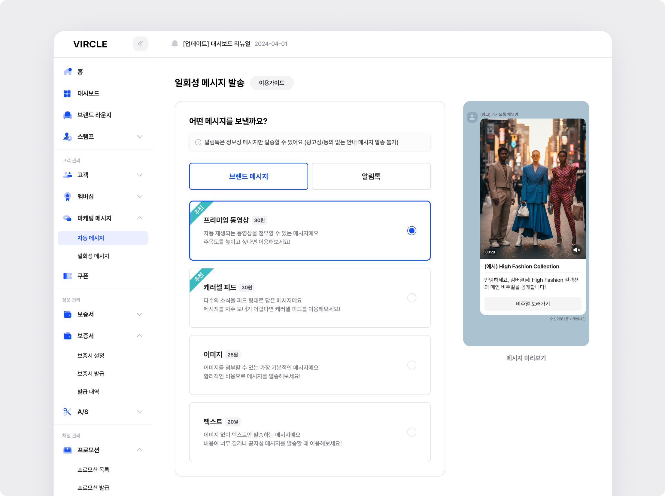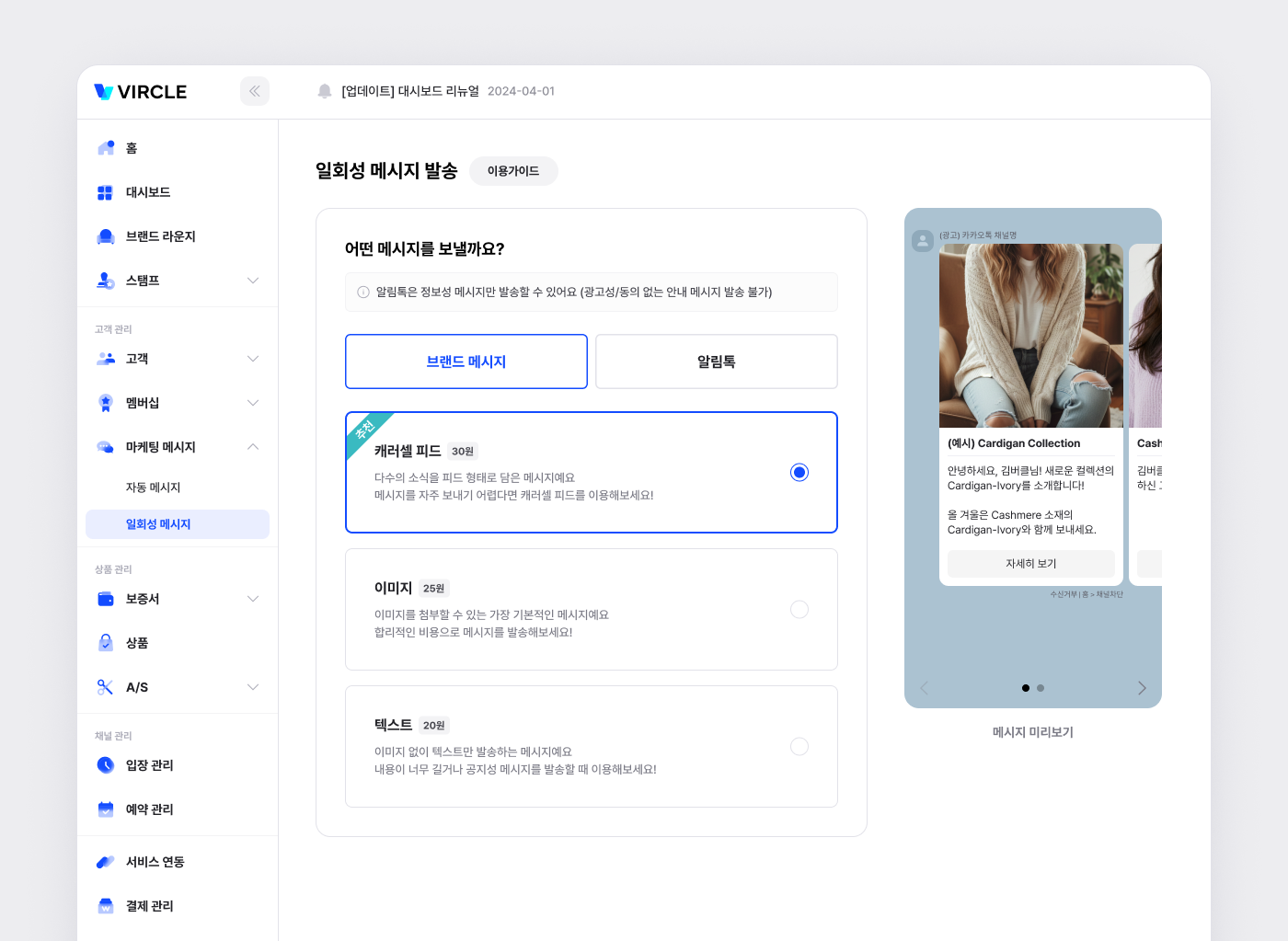 브랜드 메시지를 선택하고 유형(캐러셀 피드, 이미지, 텍스트)을 선택해주세요.