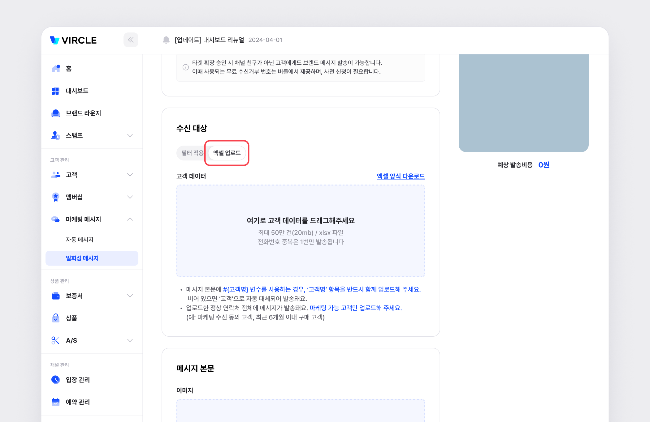 직접 업로드한 고객 리스트를 기준으로 메시지를 발송할 수 있습니다.