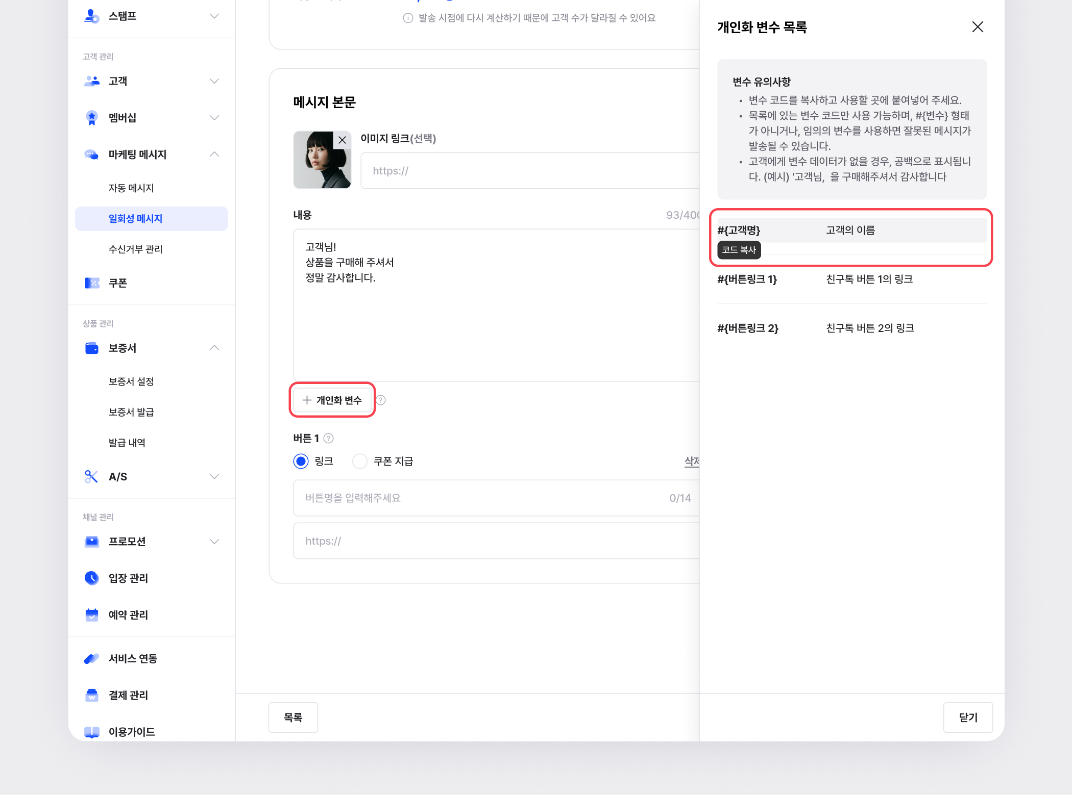 + 개인화 변수 버튼을 클릭하면, 버클에서 제공하는 변수 목록이 나와요.