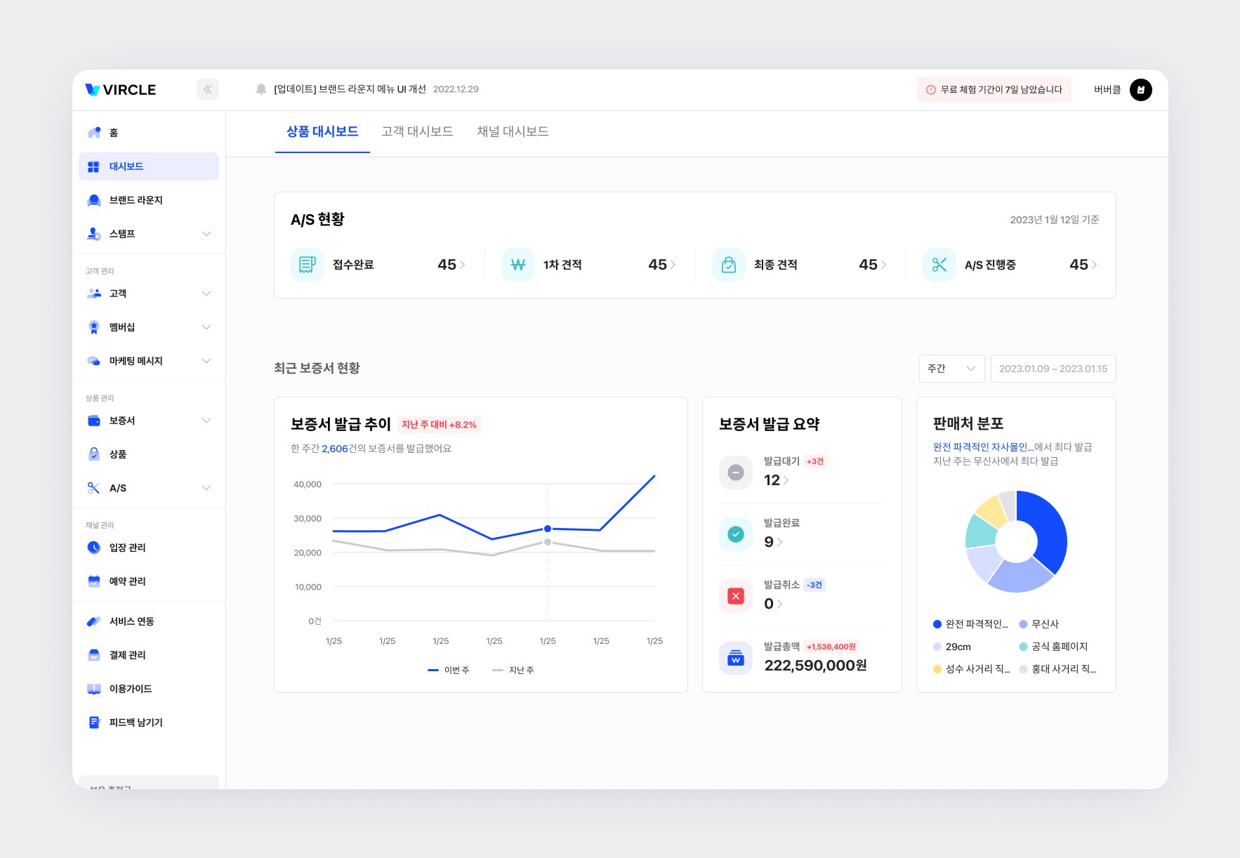 상품 판매 현황부터 A/S 접수 현황에 대한 인사이트를 제공합니다.