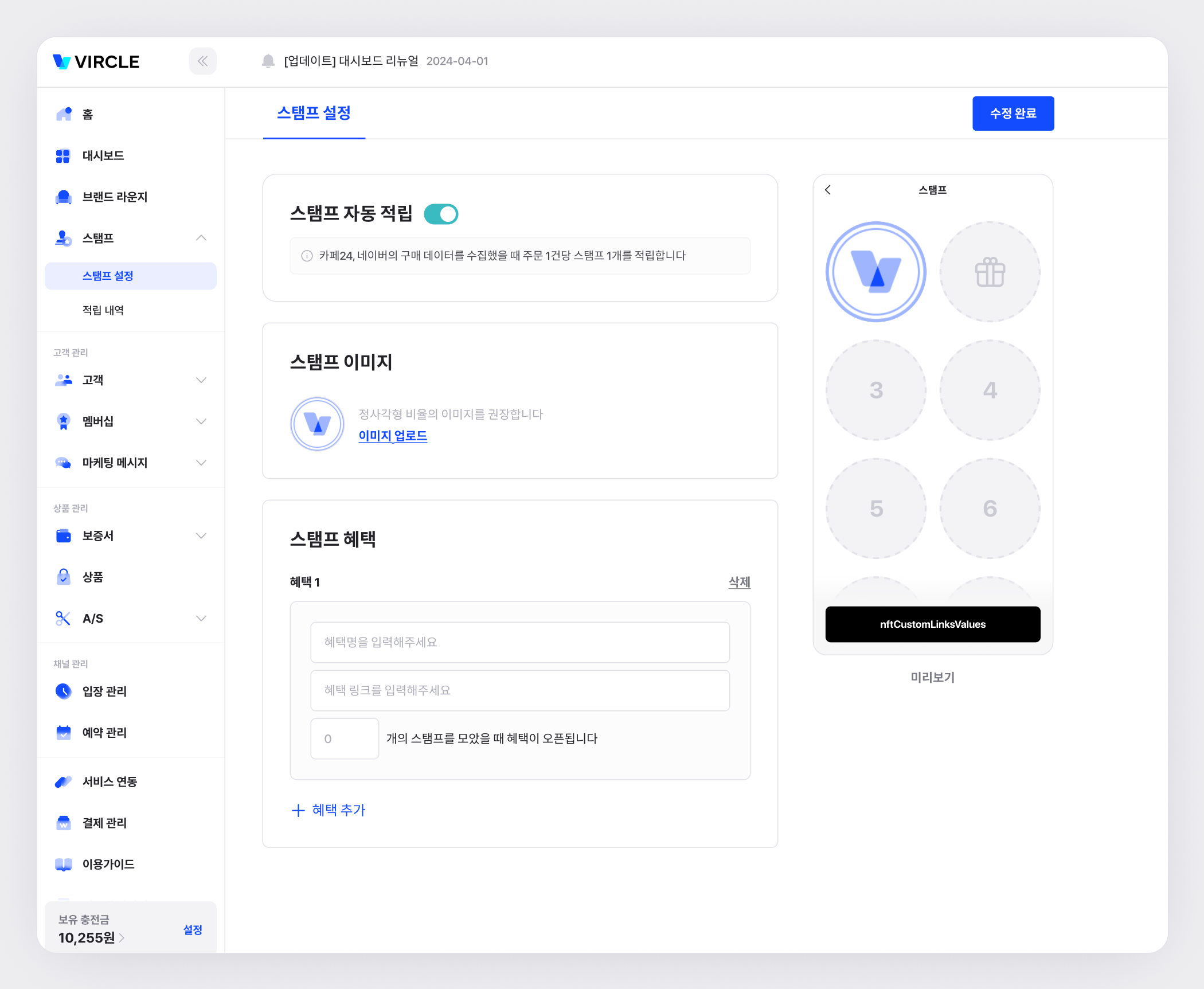 고객에게 보여지는 스탬프 이미지를 업로드할 수 있고, 스탬프를 [몇개를 모았을 때] [어떤 혜택을 줄지] 설정할 수 있습니다.