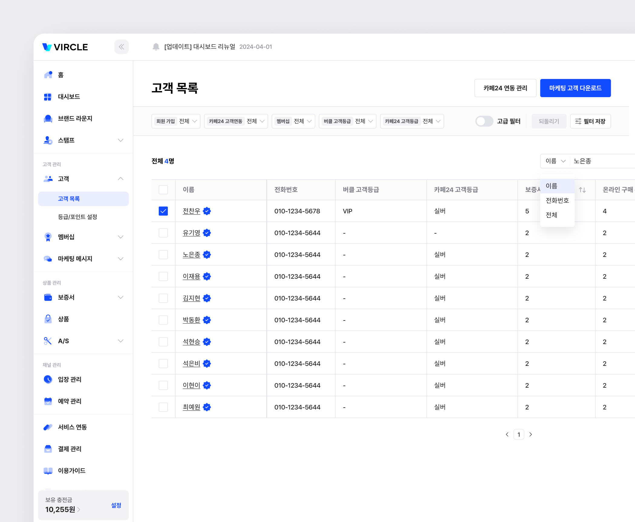 여러가지 조건을 설정하여 고객 리스트를 조회하고, 쿠폰을 지급하거나 멤버십을 발급할 수 있습니다.