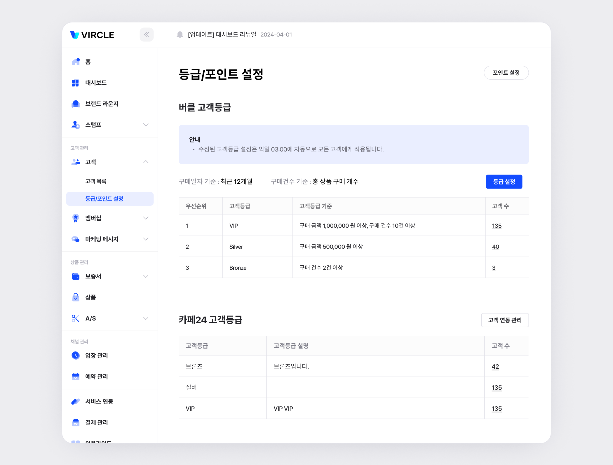 직접 설정한 조건에 따라 등급을 나누고, 등급별로 고객을 관리할 수 있습니다.