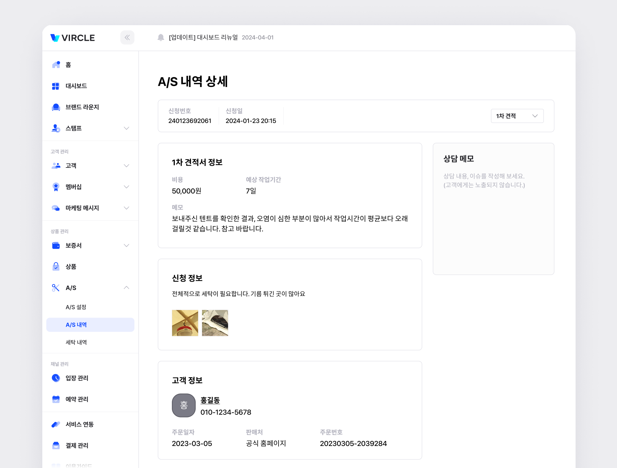 A/S 관리를 통해 고객센터, 채팅, 게시판, 전화를 통해 접수되던 A/S 요청을 한 곳에서 편리하게 관리할 수 있습니다.