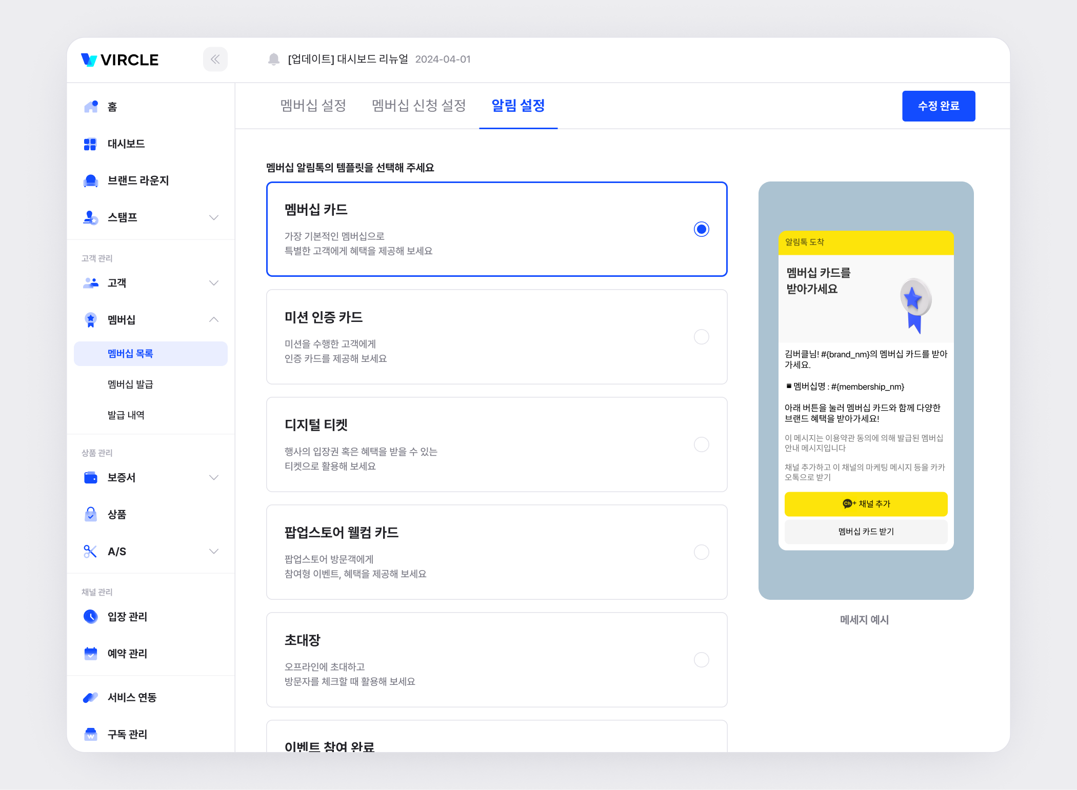 멤버십 수정버튼을 클릭,[멤버십 설정] 페이지의 [알림 설정] 탭에서 설정할 수 있어요.