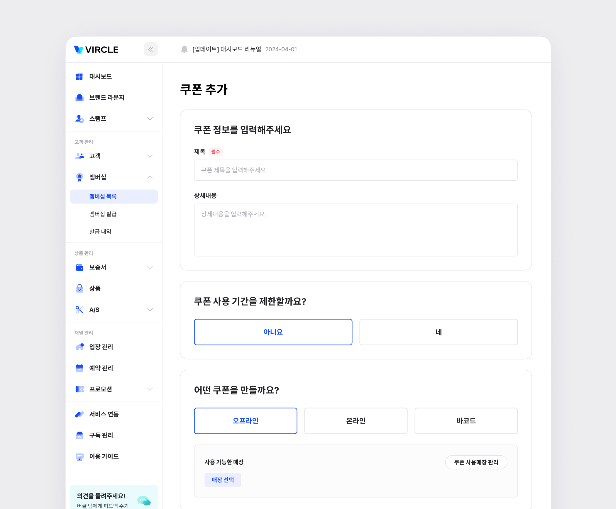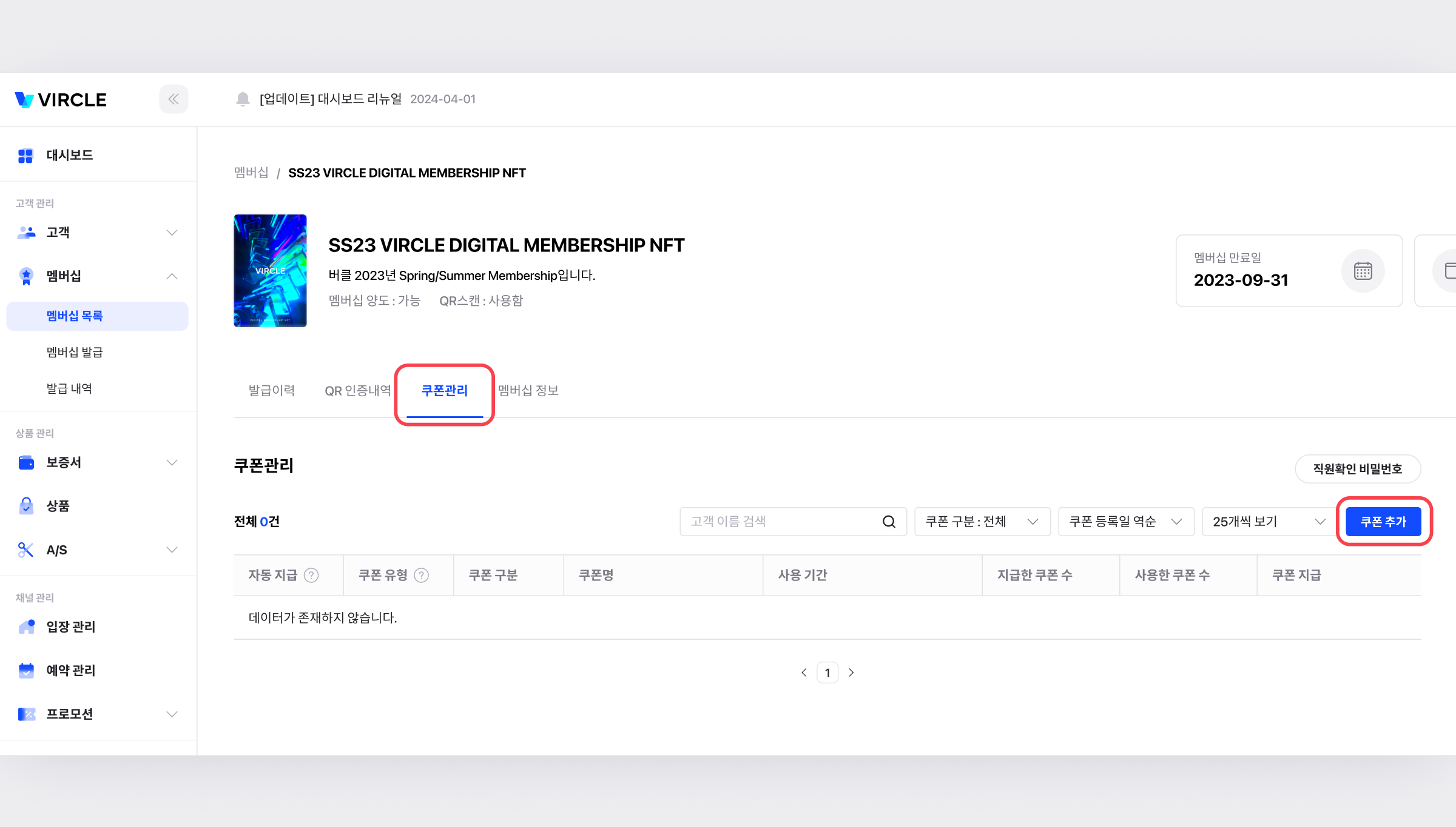 쿠폰 추가는 [멤버십 설정] 완료 후, 해당 멤버십 페이지에서 가능합니다.