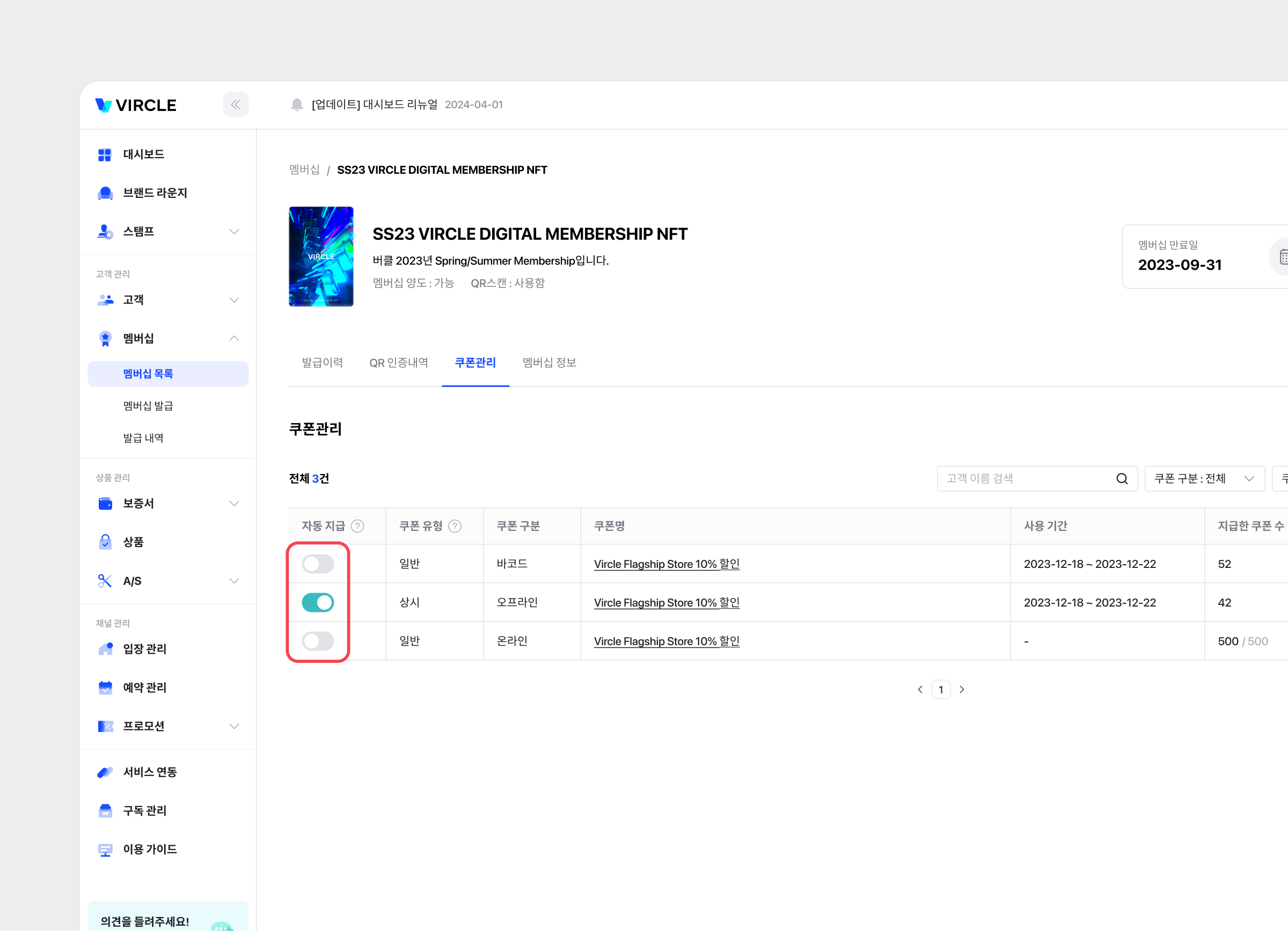 토글을 켜면, 고객에게 멤버십이 발급될 때 자동으로 쿠폰도 같이 지급됩니다.