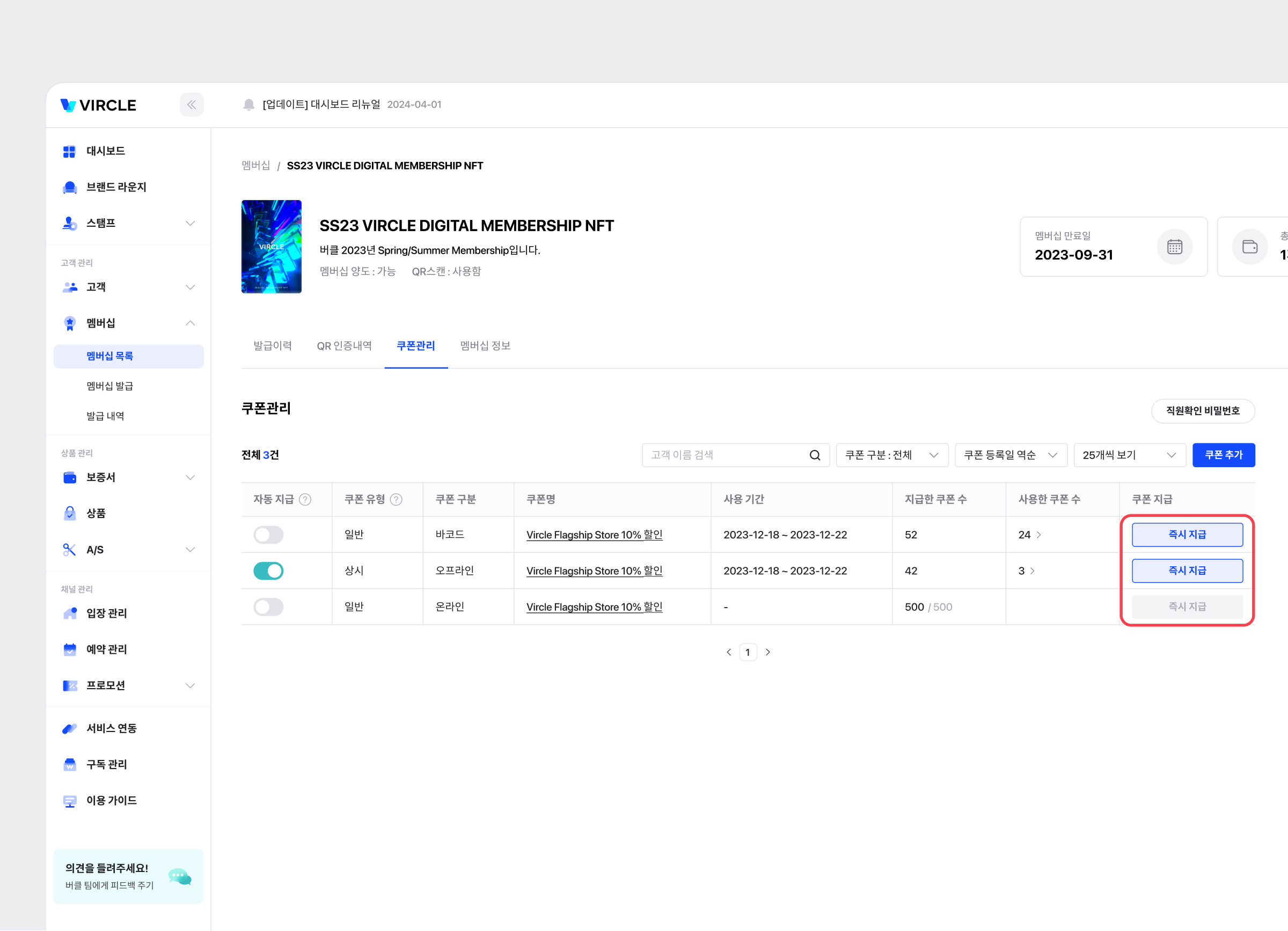 모든 입력을 마친 후 저장하면, 쿠폰을 [자동 지급]하거나 [즉시 지급]을 할 수 있습니다.