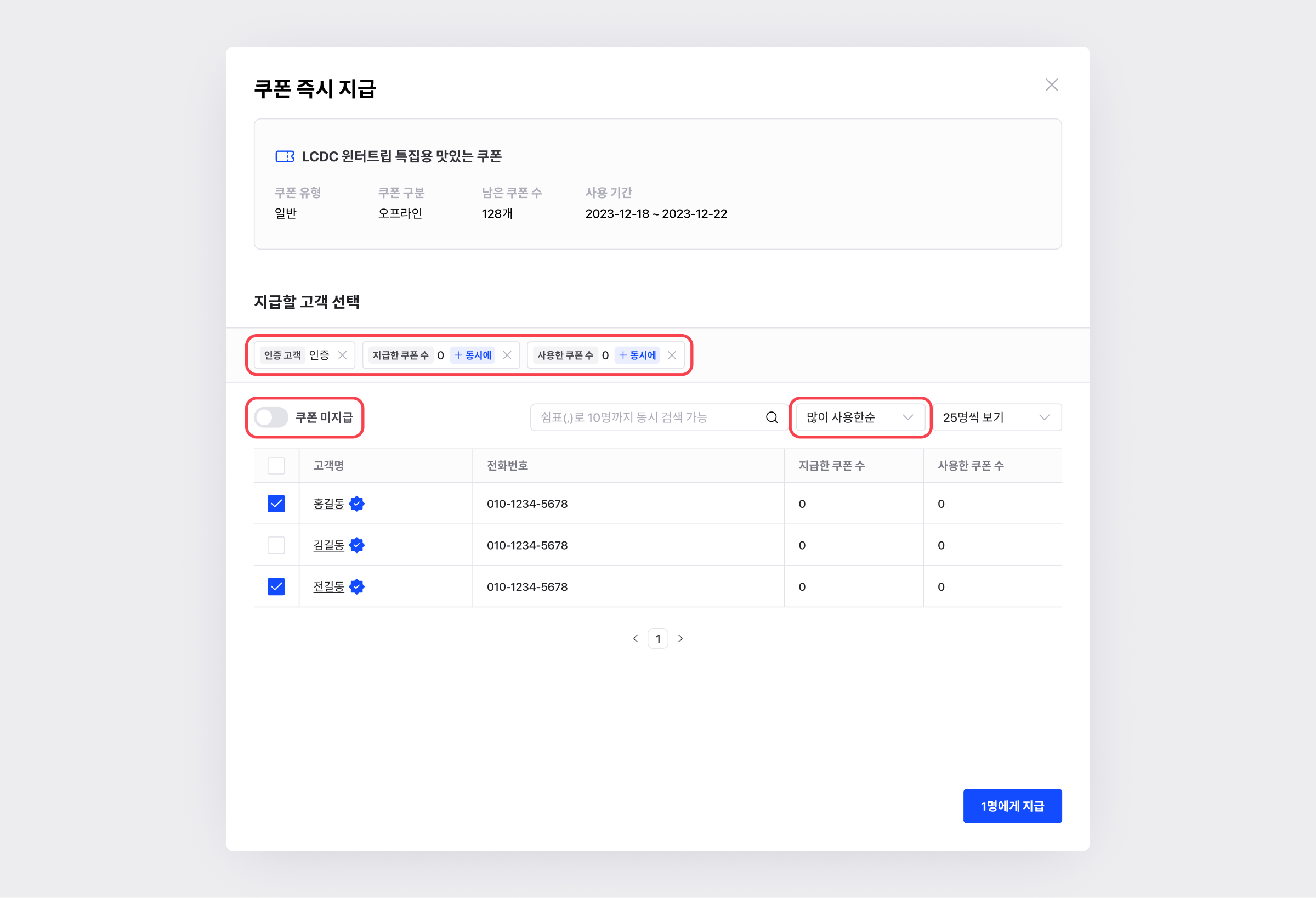 멤버십을 보유한 고객 중 쿠폰을 지급할 고객을 선택하여 즉시 지급할 수 있습니다.