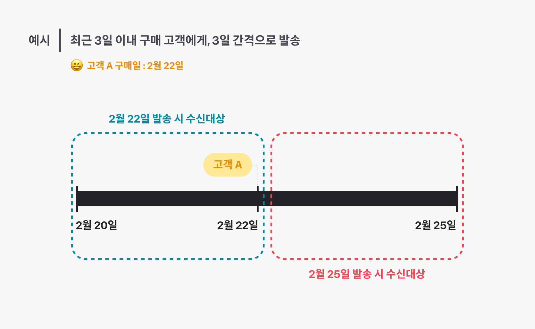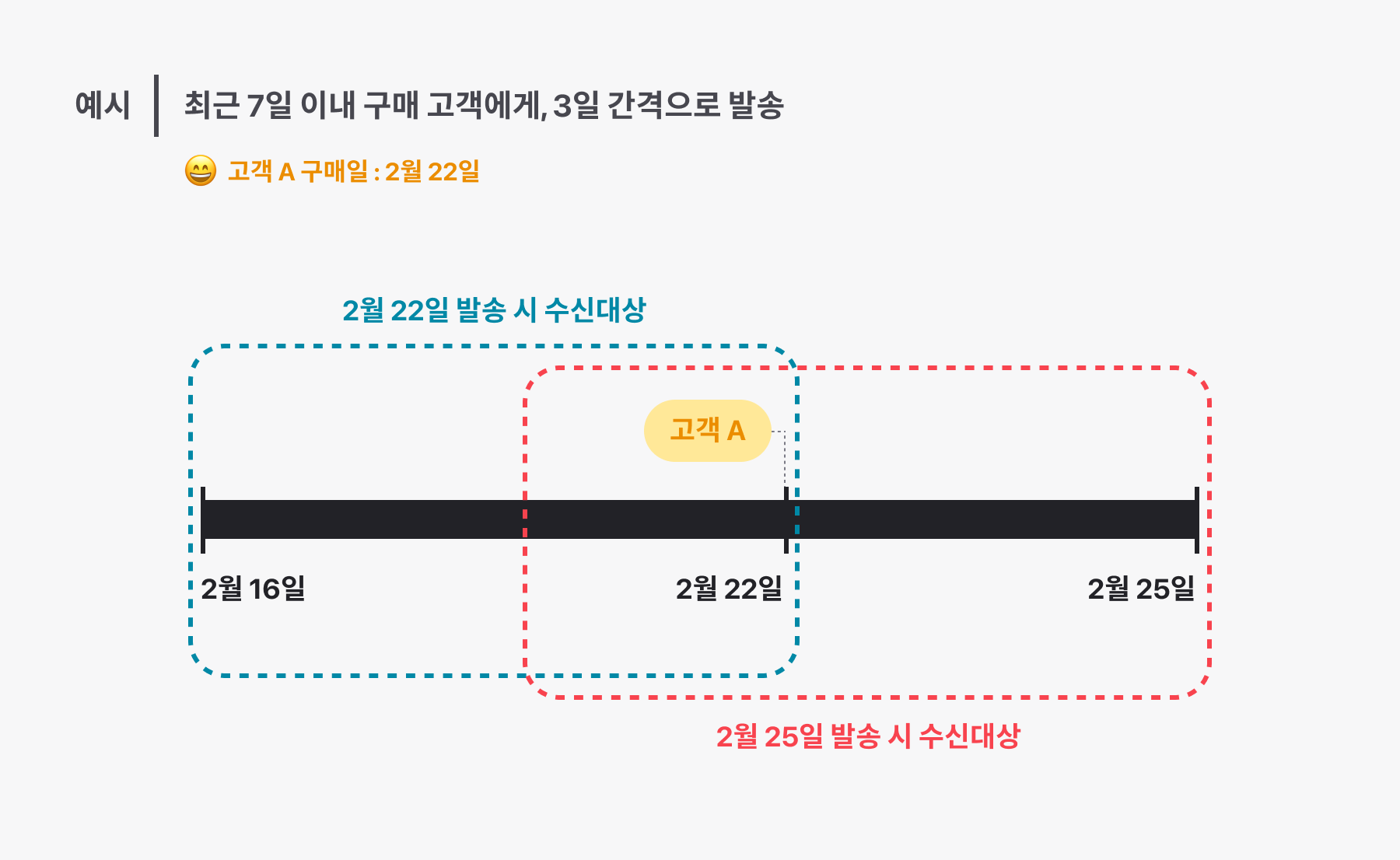 2월 25일 → 조건: '2/22 ~ 2/25' 구매 고객 → 고객 A에게 중복 발송하지 않음