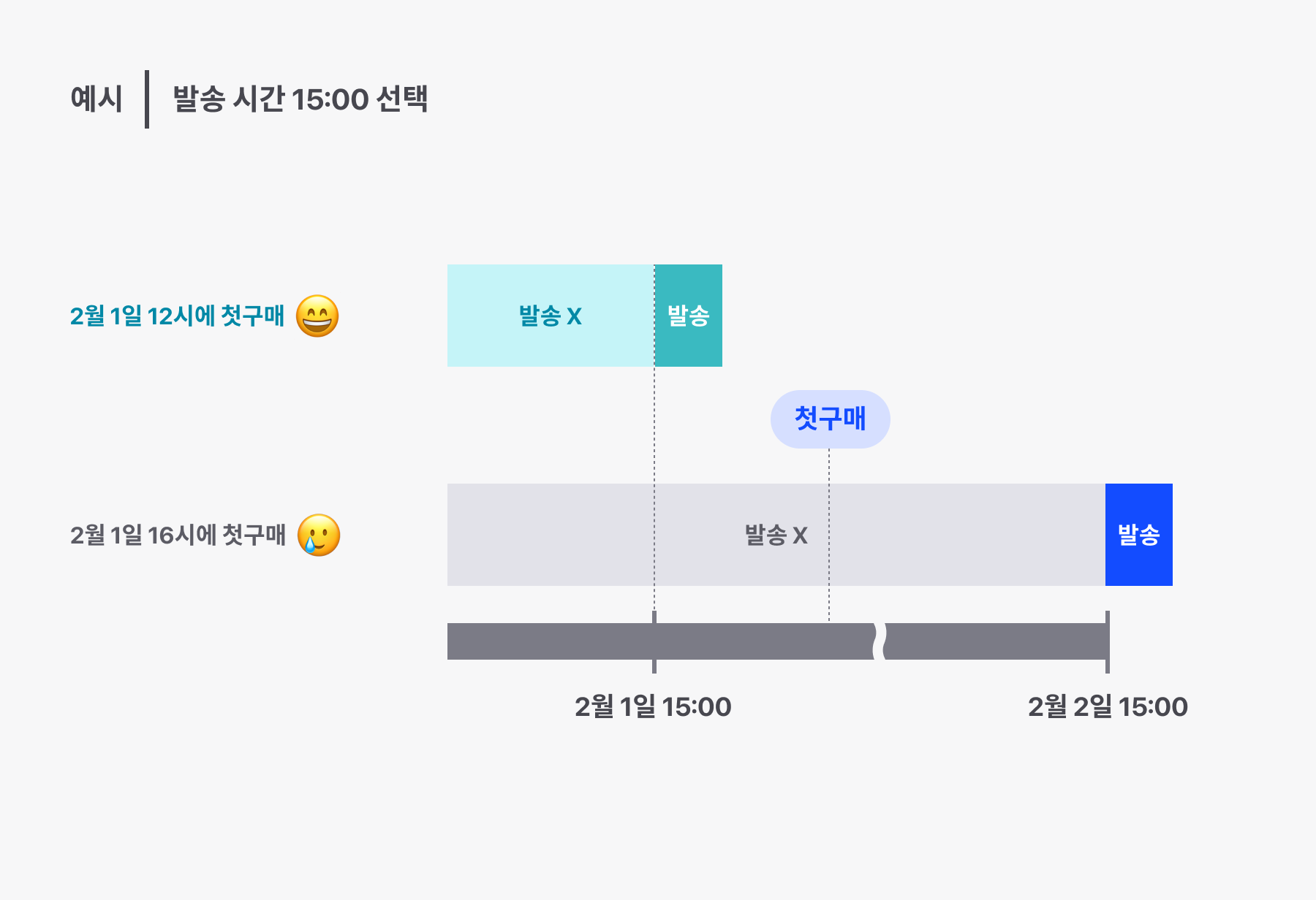 발송 시간이 지난 뒤에 조건을 충족(예시: 첫구매)했다면 다음 날에 발송돼요.