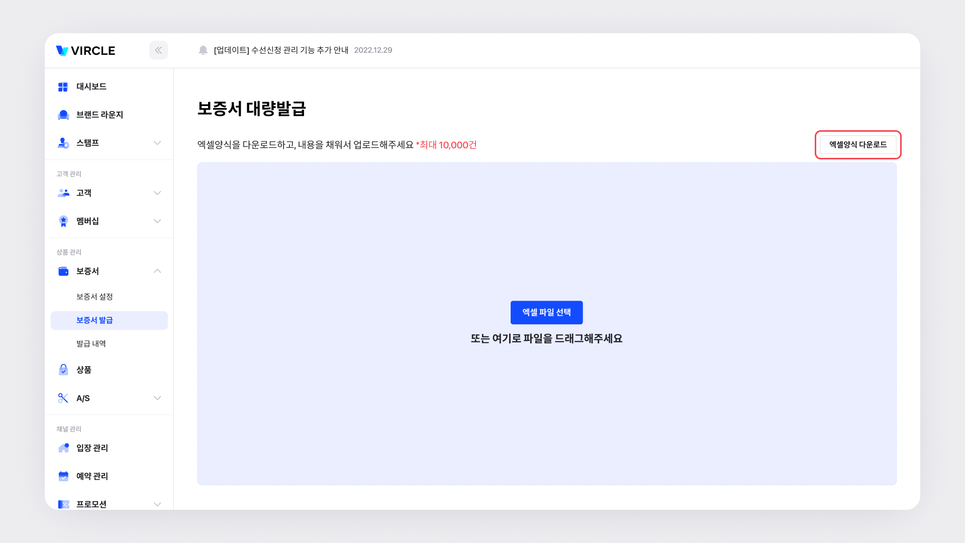 플랫폼, 오프라인 판매 시 데이터를 엑셀로 합쳐 여러 판매건의 보증서를 한번에 발급할 수 있어요.