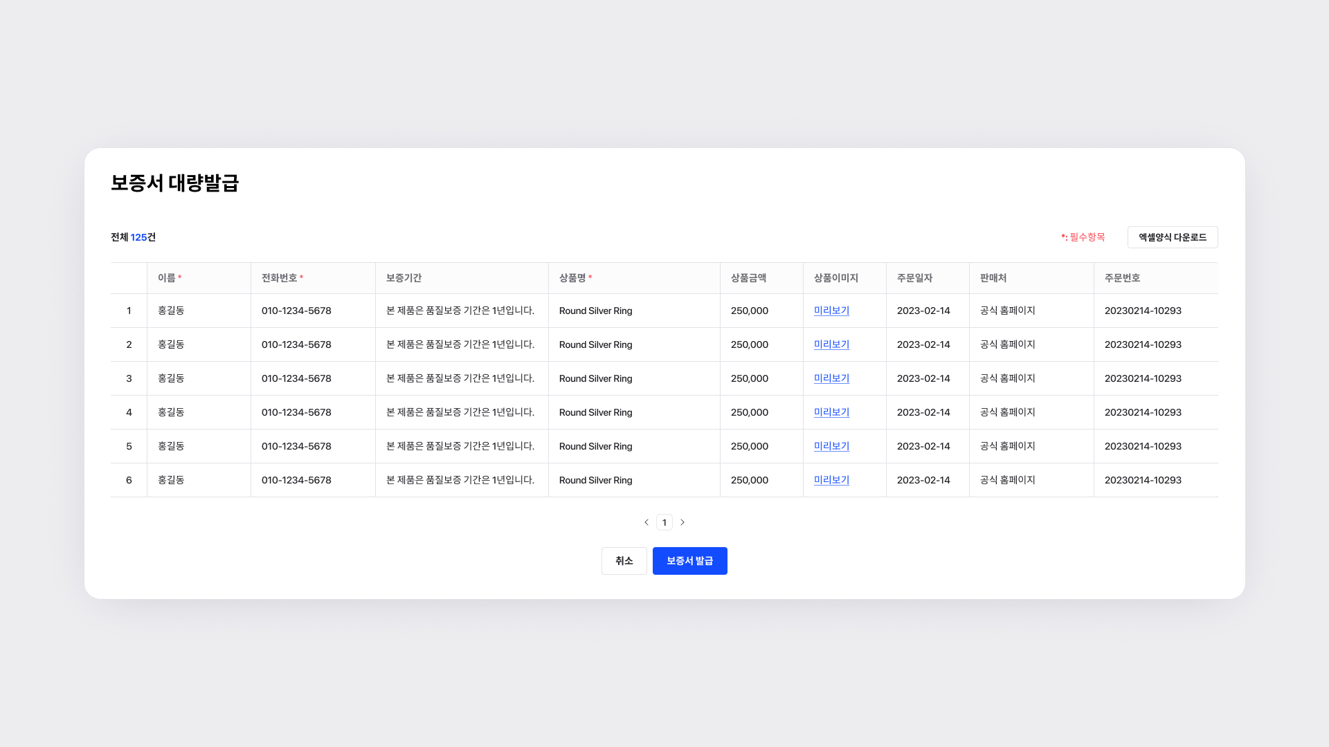 고객 정보를 직접 입력해 1명의 고객에게 보증서를 발급하는 방식입니다.