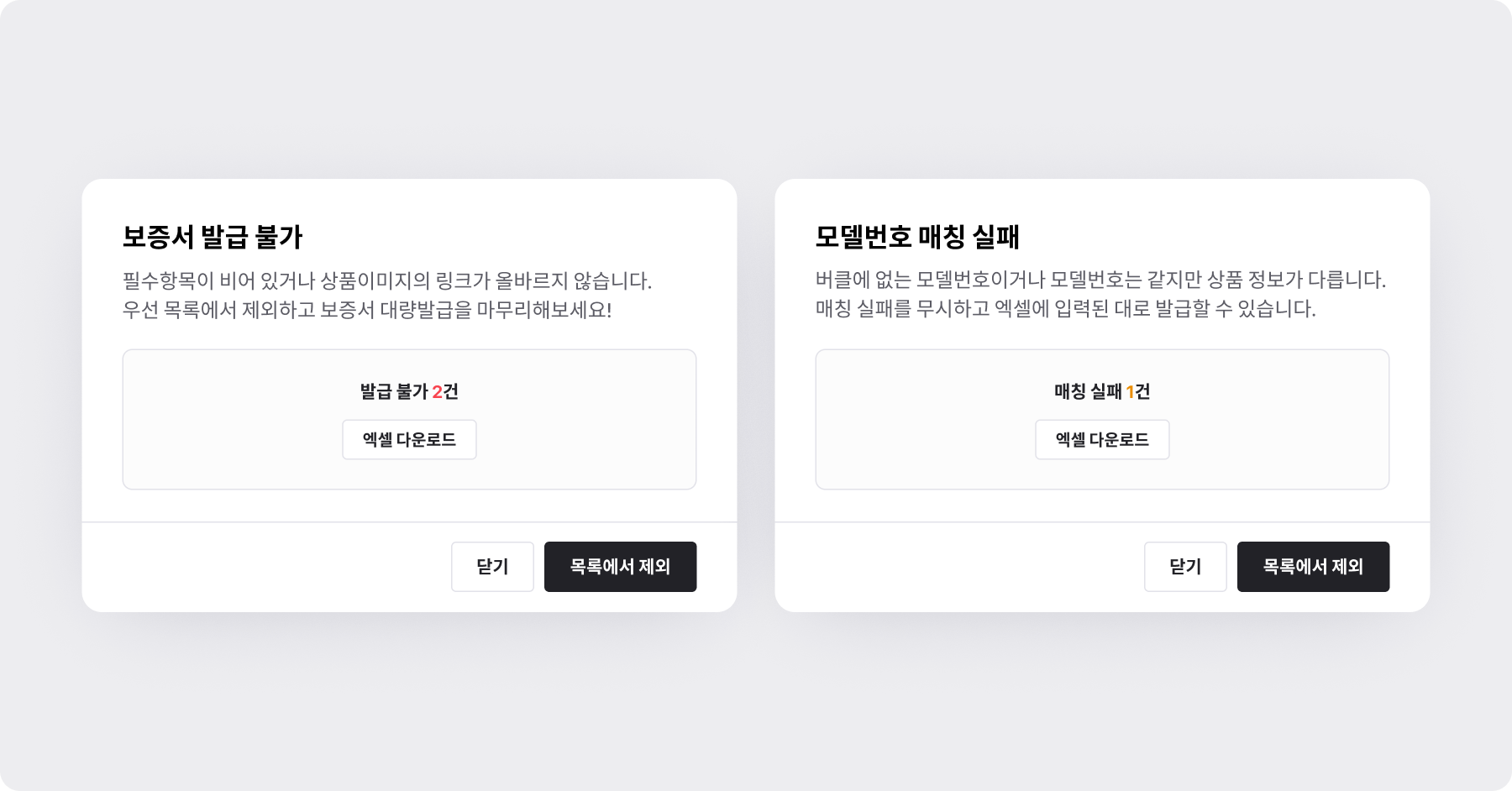발급 불가 N건 보기매칭 실패 N건 보기버튼 클릭 시, 에러 내용을 볼 수 있습니다.