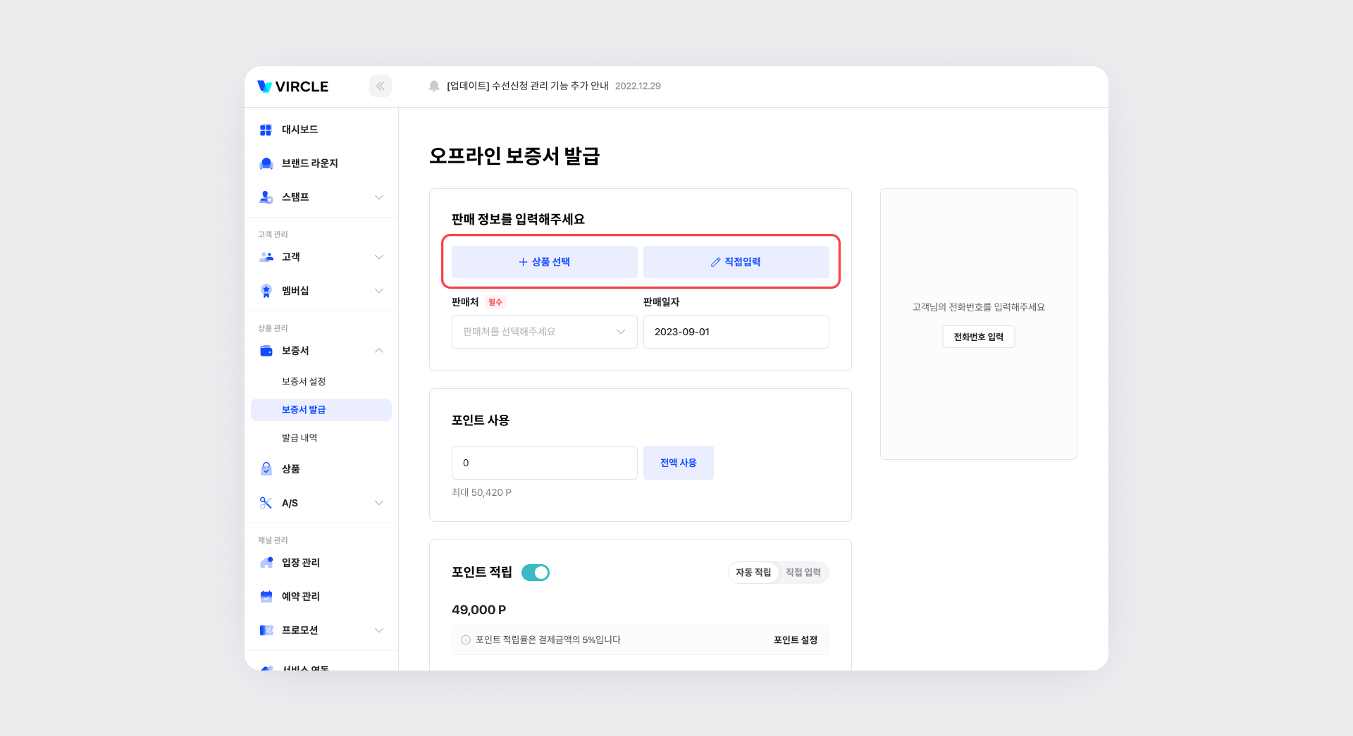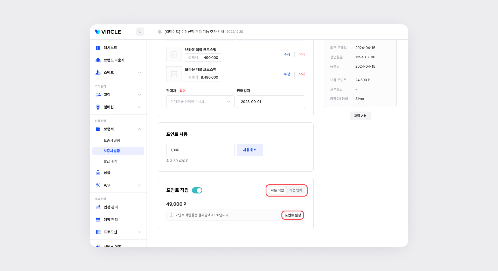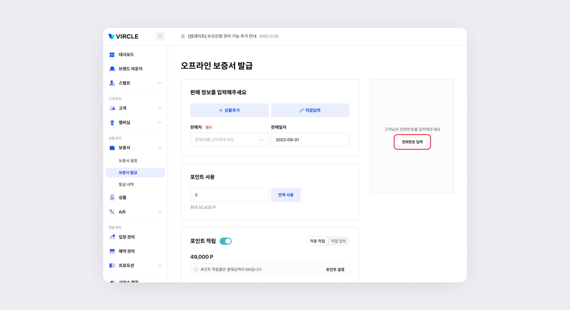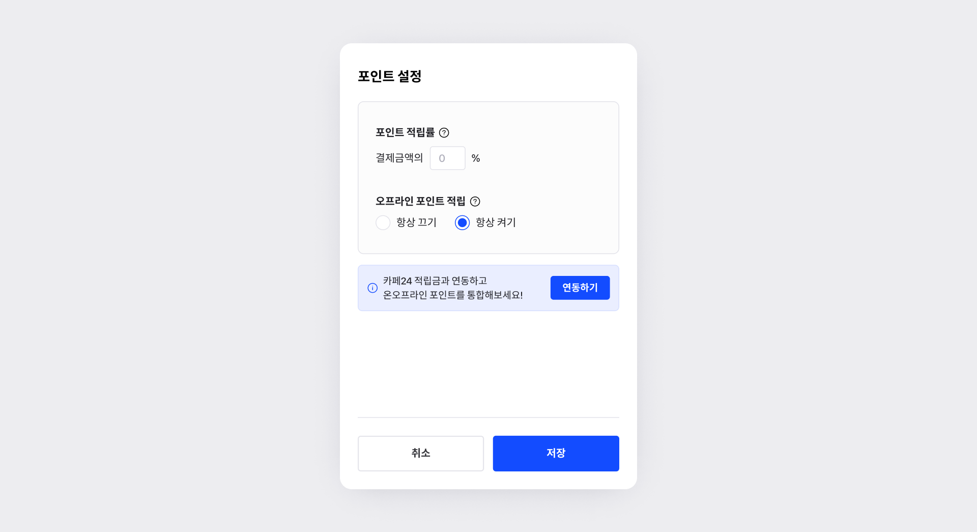 오프라인 보증서를 발급할 때, 포인트 적립 기능이 항상 켜져 있도록 기본값을 설정할 수 있습니다.