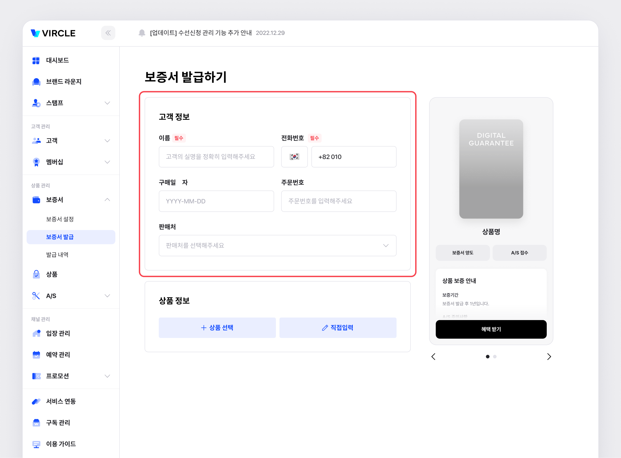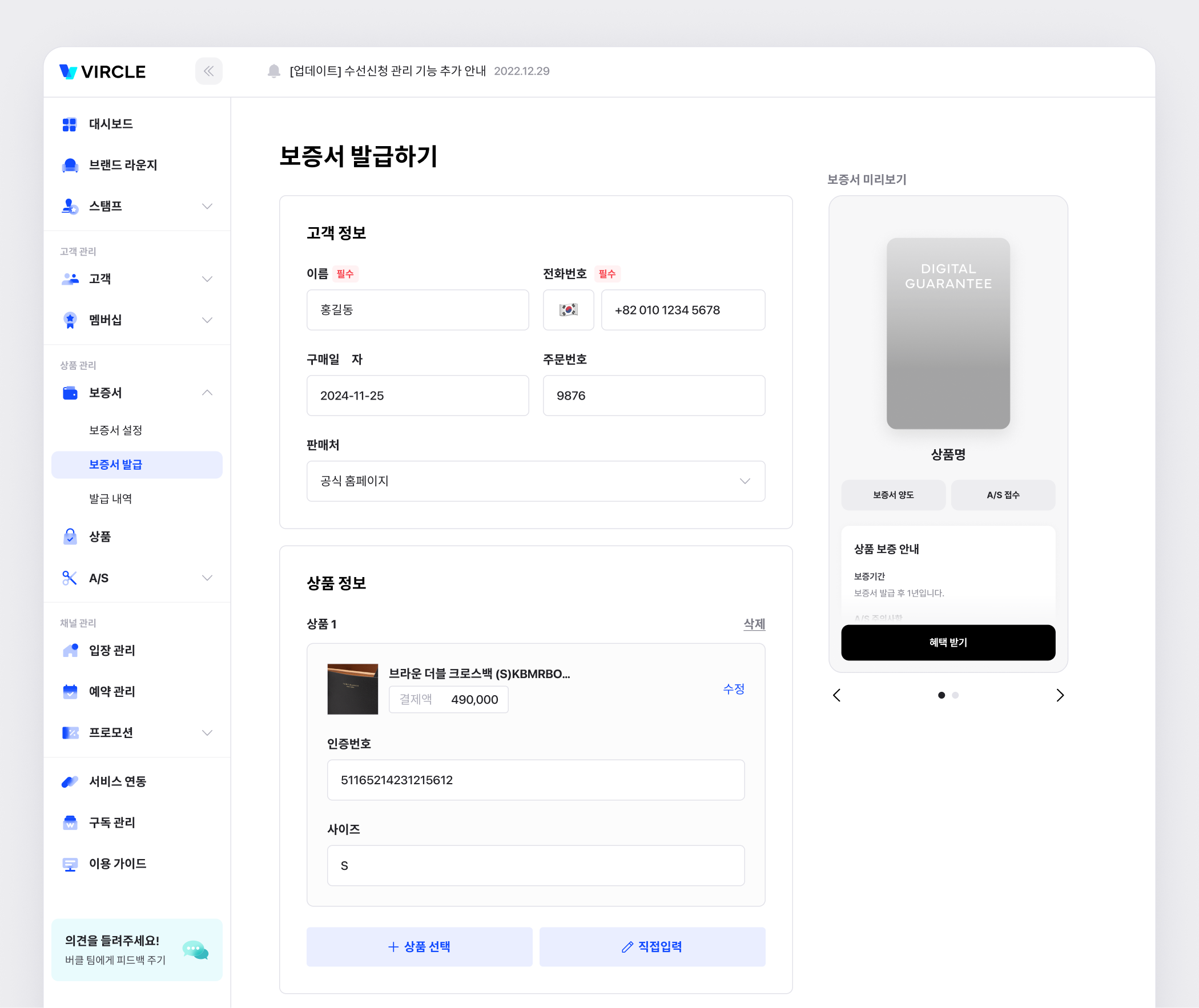 보증서 발급을 위해서 고객 정보(이름, 전화번호)와 상품 정보가 필요합니다.