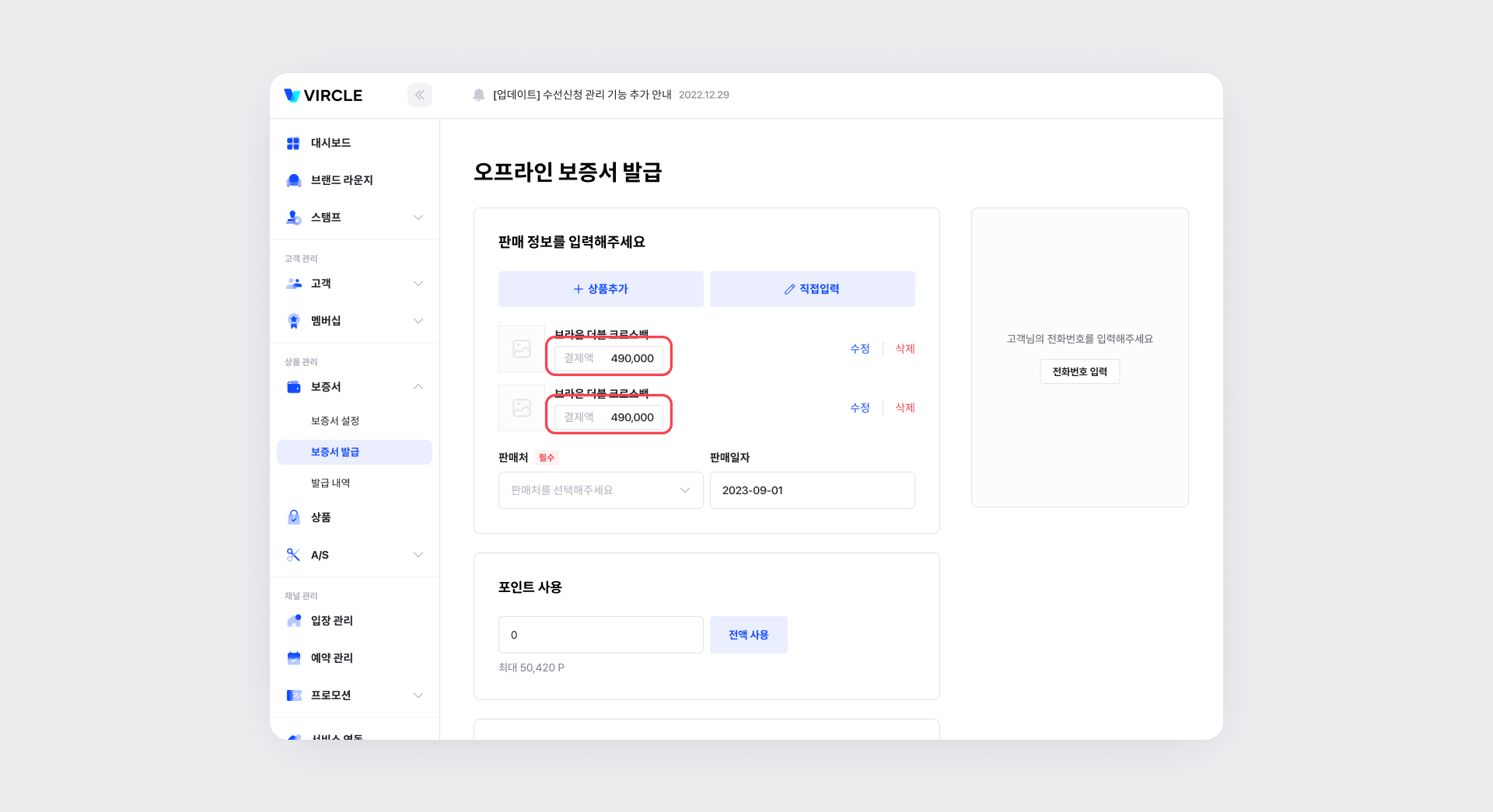 보증서는 [전화번호]를 기준으로 발급됩니다.