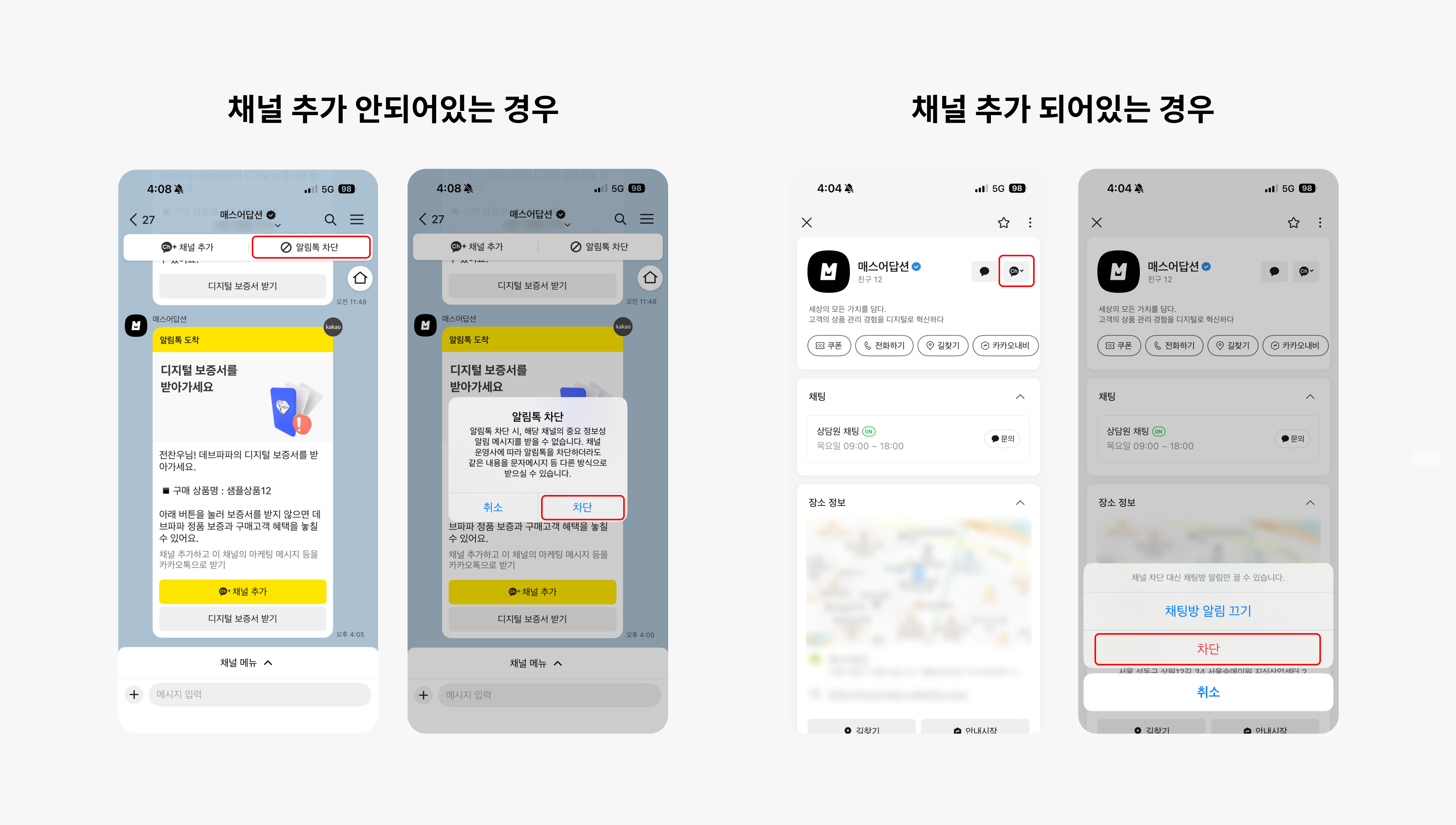 브랜드의 카카오톡 채널과 수신거부 번호를 차단하실 수 있게 안내해주세요.