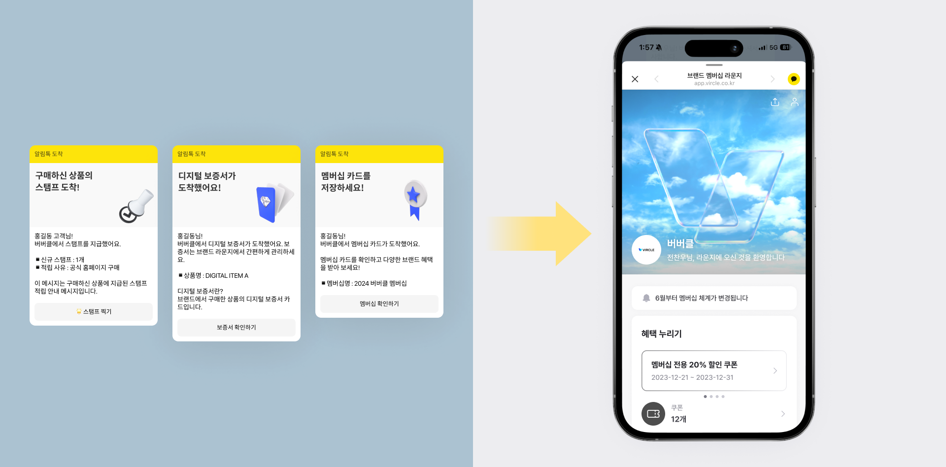 고객은 스탬프 지급 / 보증서 발급 / 멤버십 발급 알림톡을 통해