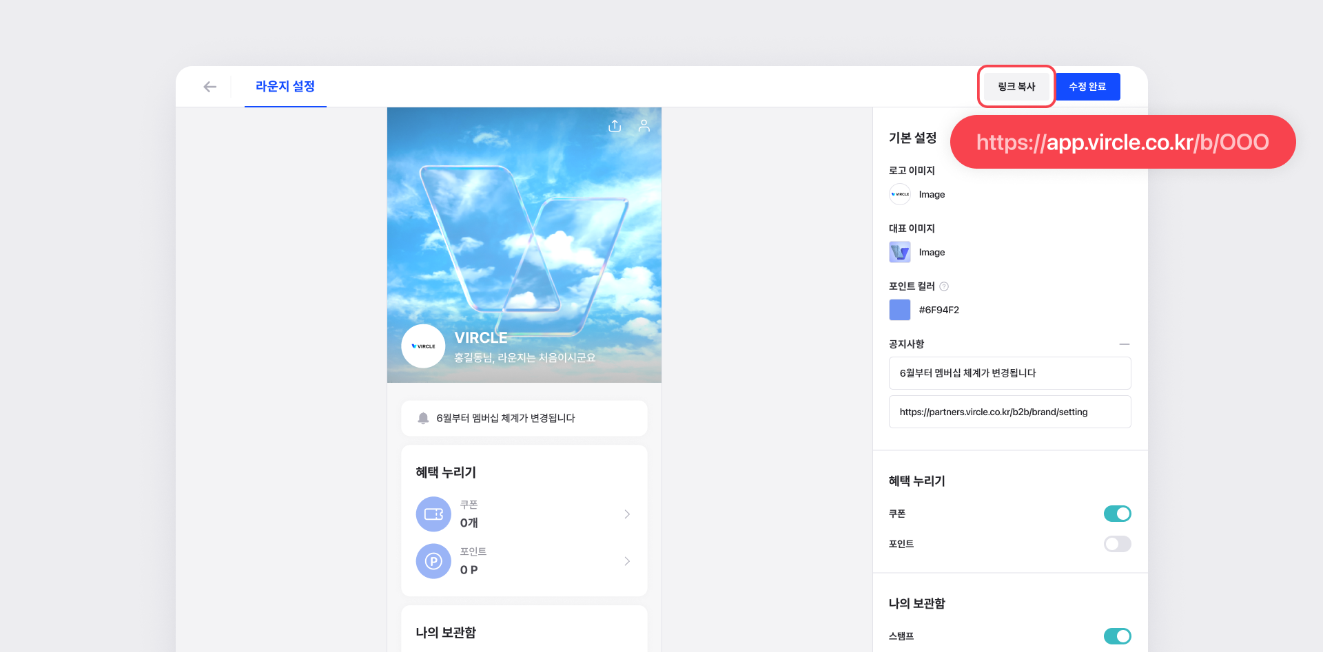 링크 복사버튼을 클릭하면 브랜드 라운지 URL이 복사됩니다.복사한 URL을 고객에게 제공하여 라운지에 진입하게 하는 것도 가능합니다.